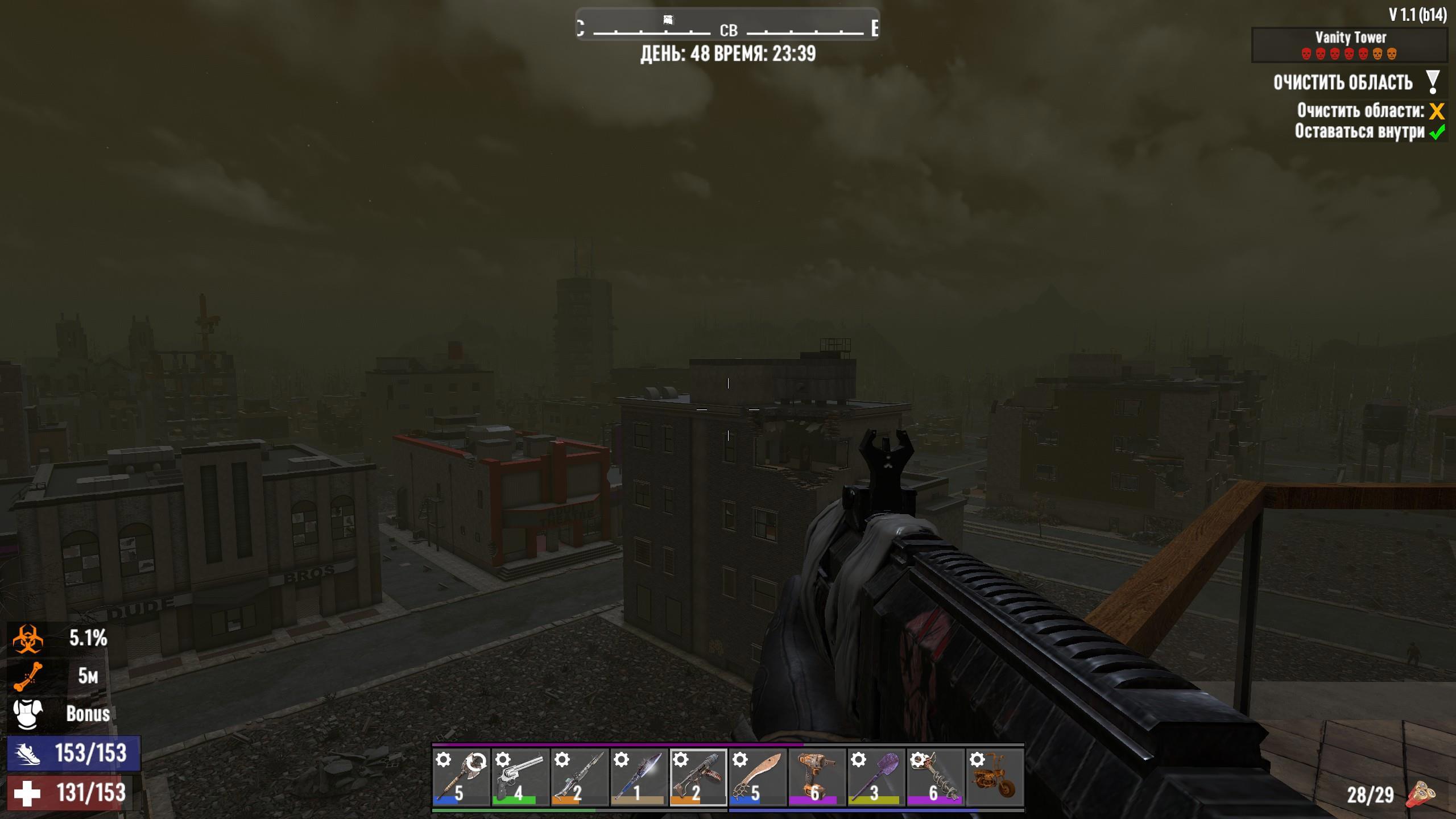 Интереса и разнообразия добавляет игра при дневном свете и по ночам. Прикольно, знаете ли, стрематься каждого шороха и стараться не привлекать зомбей поблизости. Прикольнее лишь забаррикадироваться где-нибудь наверху и расстреливать мертвяков из снайперки, набивая экспу и дожидаясь рассвета.