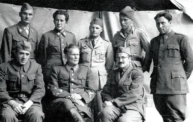 Стоят слева направо: Арсо Йованович, Милован Джилас, неизвестный, Слободан Пенезич, Александр Ранкович.