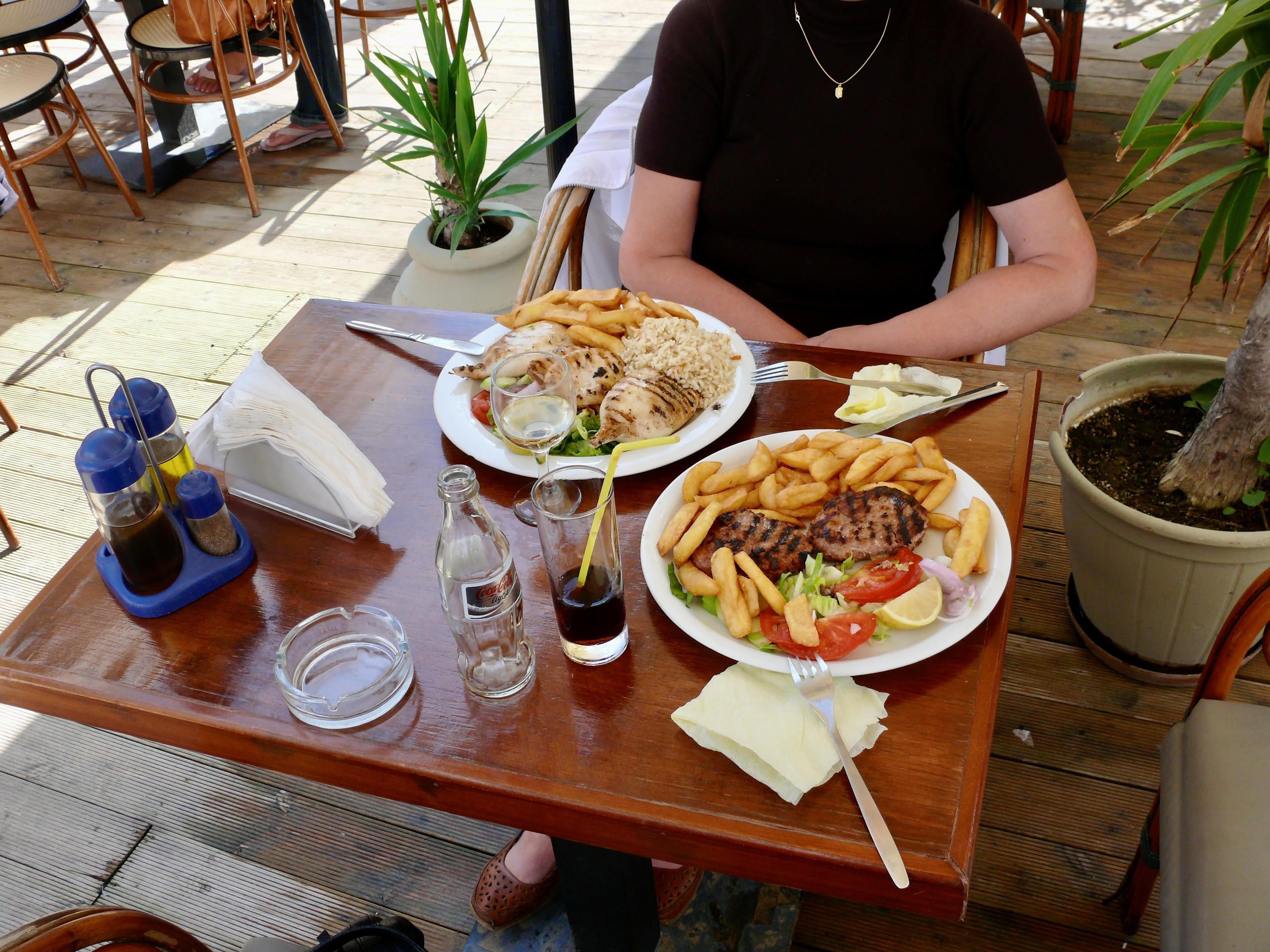 И только заехав в Сидари, поняли, что сделали ошибку: в Дасье в основном останавливаются ОЧЕНЬ пожилые люди -- это хорошо, потому что тихо, и плохо, потому что уже во вторую неделю октября поселок пустеет и таверны начинают закрываться. В Сидари же в это время бурлит жизнь; отельчики там, правда, в основном 3* и ниже, но зато уютные, едален разного рода невообразимо много, цены в них невысоки, качество жратвы очень высокое (лучше, чем где-либо на острове), а порции умопомрачительно огромные.