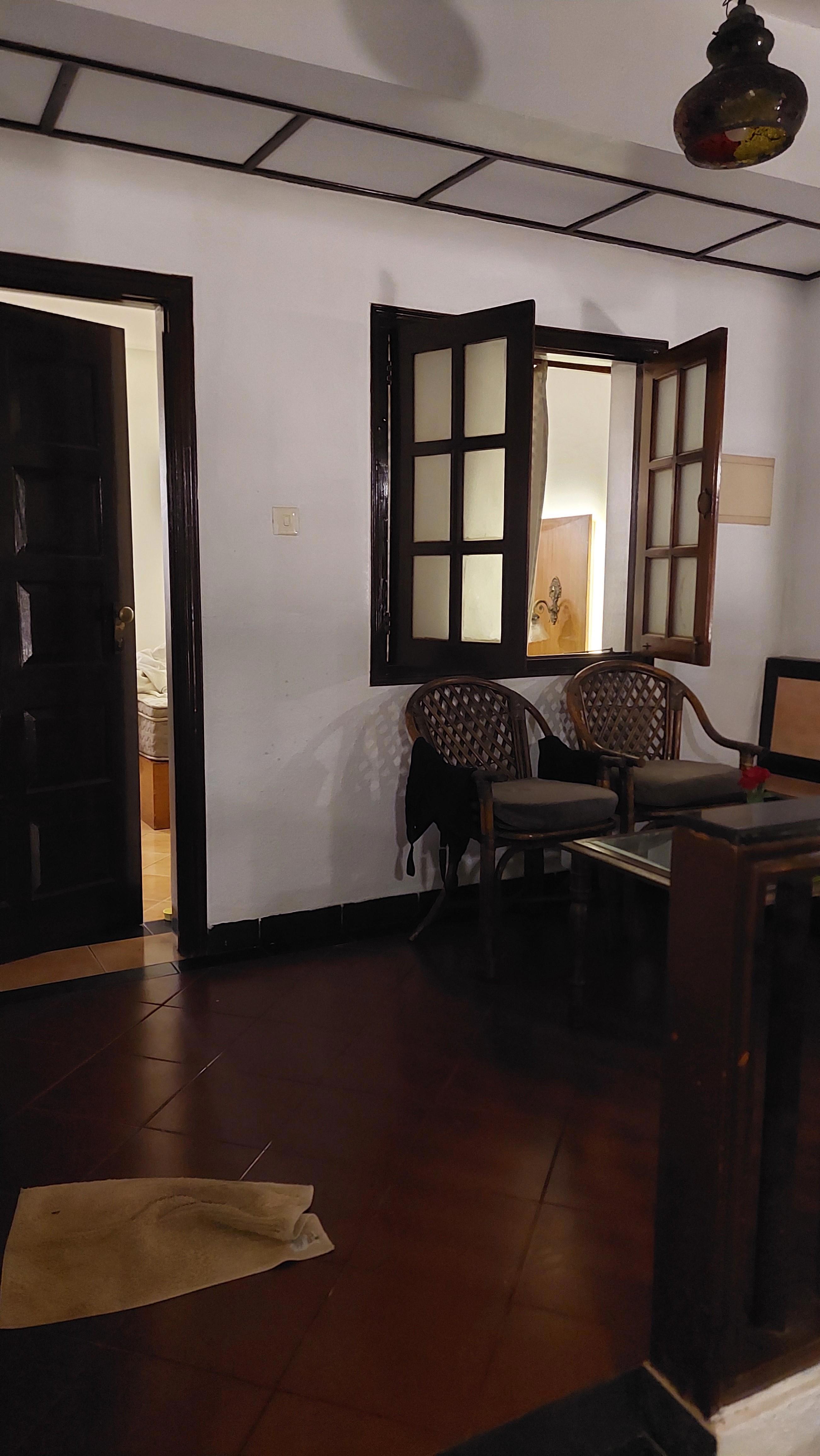 Около 12.00 нас заселили в номер. Всё как и ожидалось, номер, как пишут подуставший, но всё, что надо есть, двухспалка, трюмо, холодильник. Простенький туалет с душем, соответственно кондиционер и вентилятор под потолком. Когда ходили на завтрак, то переживали, что дадут номер на втором этаже рядом со столовой, откуда несло на весь коридор едой и гарью, повезло, первый этаж. Своё крыльцо.