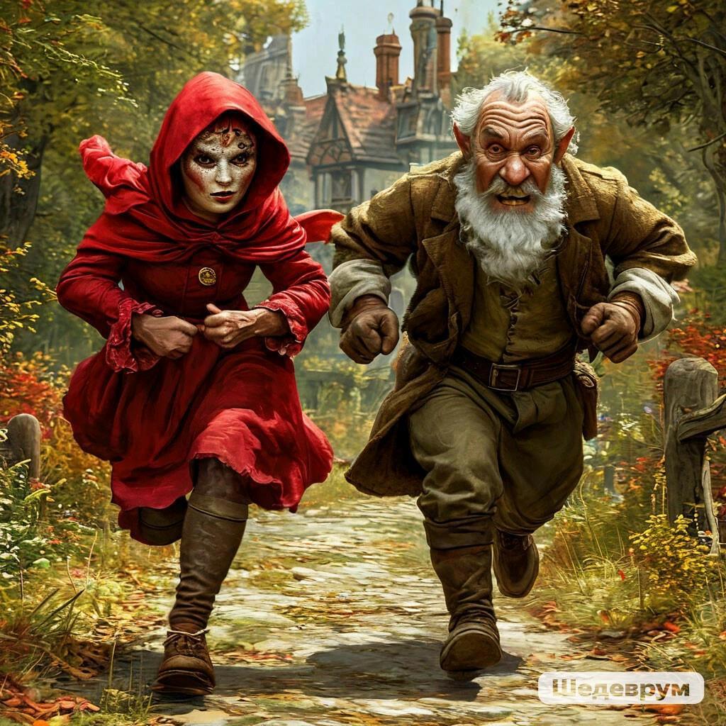 Запрос в Шедеврум "Шапокляк в красной шапочке помогает вместо доктора Ватсана расследовать преступление связанное с главным подозреваемых, полем жевущем на болоте, а не под мостом - Шрэком."