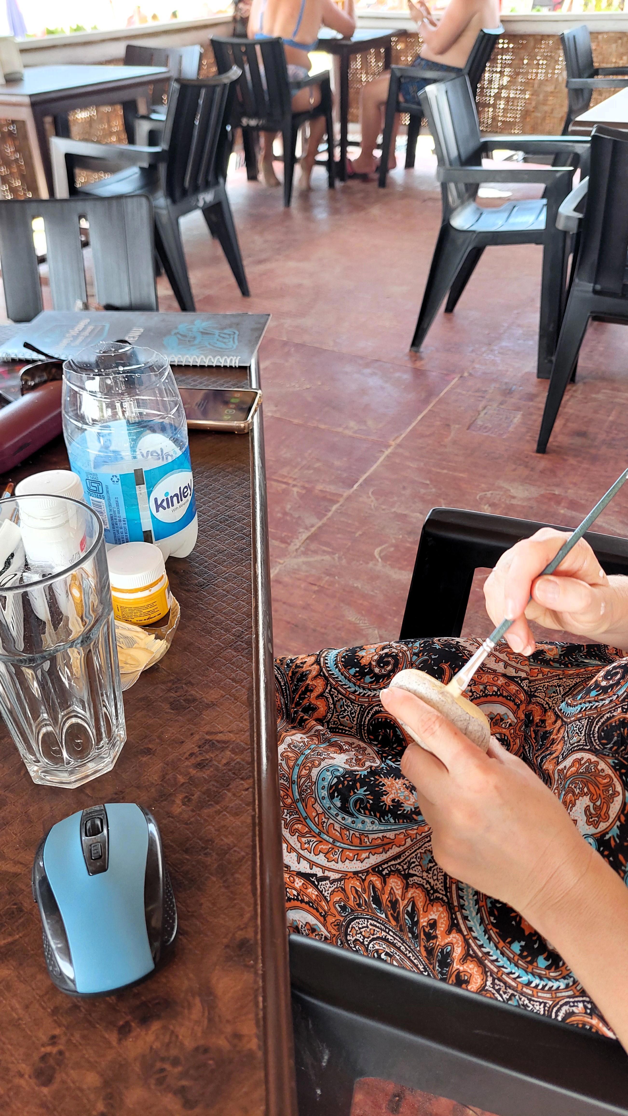 Позвонили с работы, инженер, заменяющий меня не справился, не его оборудование, пришлось подключаться и настраивать железку. Шум прибоя, ветерок, сегодня лёгкая дымка, оно и лучше, не жарко. Наташа, сидит рядом, разукрашивает камушки.