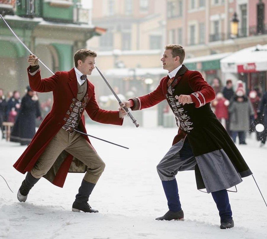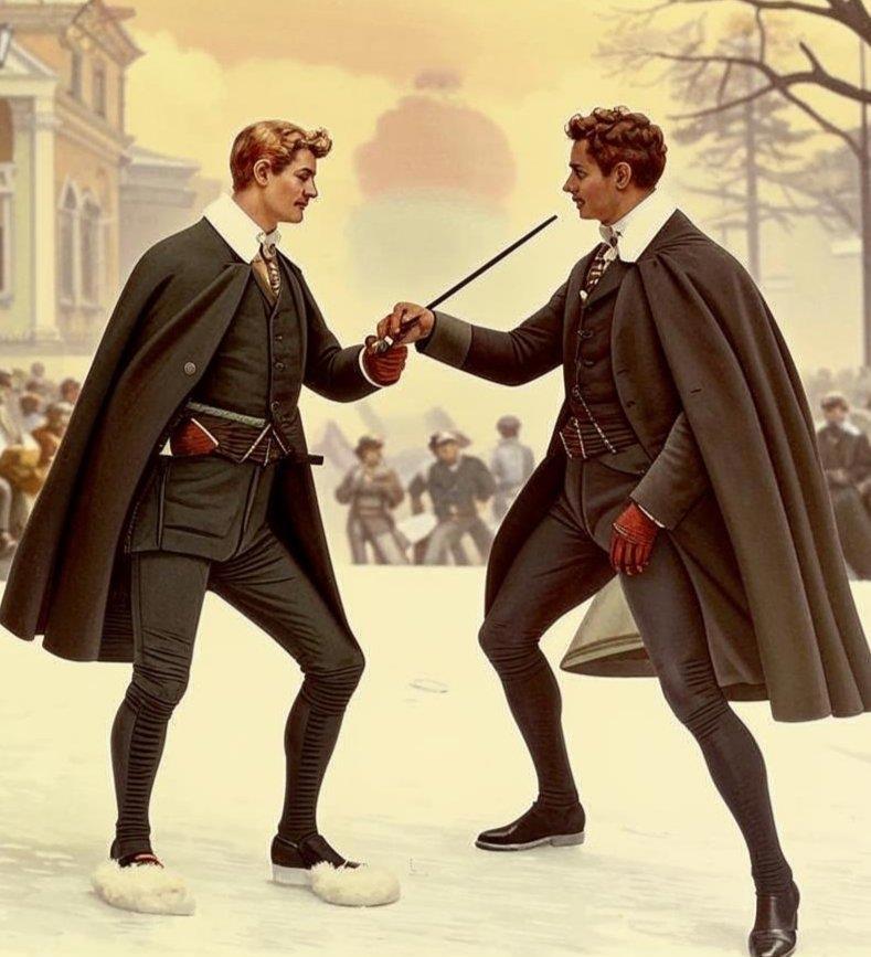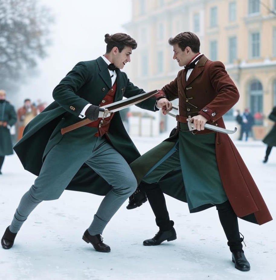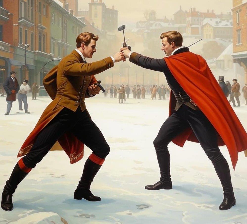 Автор: Натан Теменьполучилась по запросу у кандинского. Задумал автор иллюстрацию создать к проде Стажёра. Там у гг дуэль случилась, с кровопролитием, с применением холодного и режущего. И вот что вышло.
