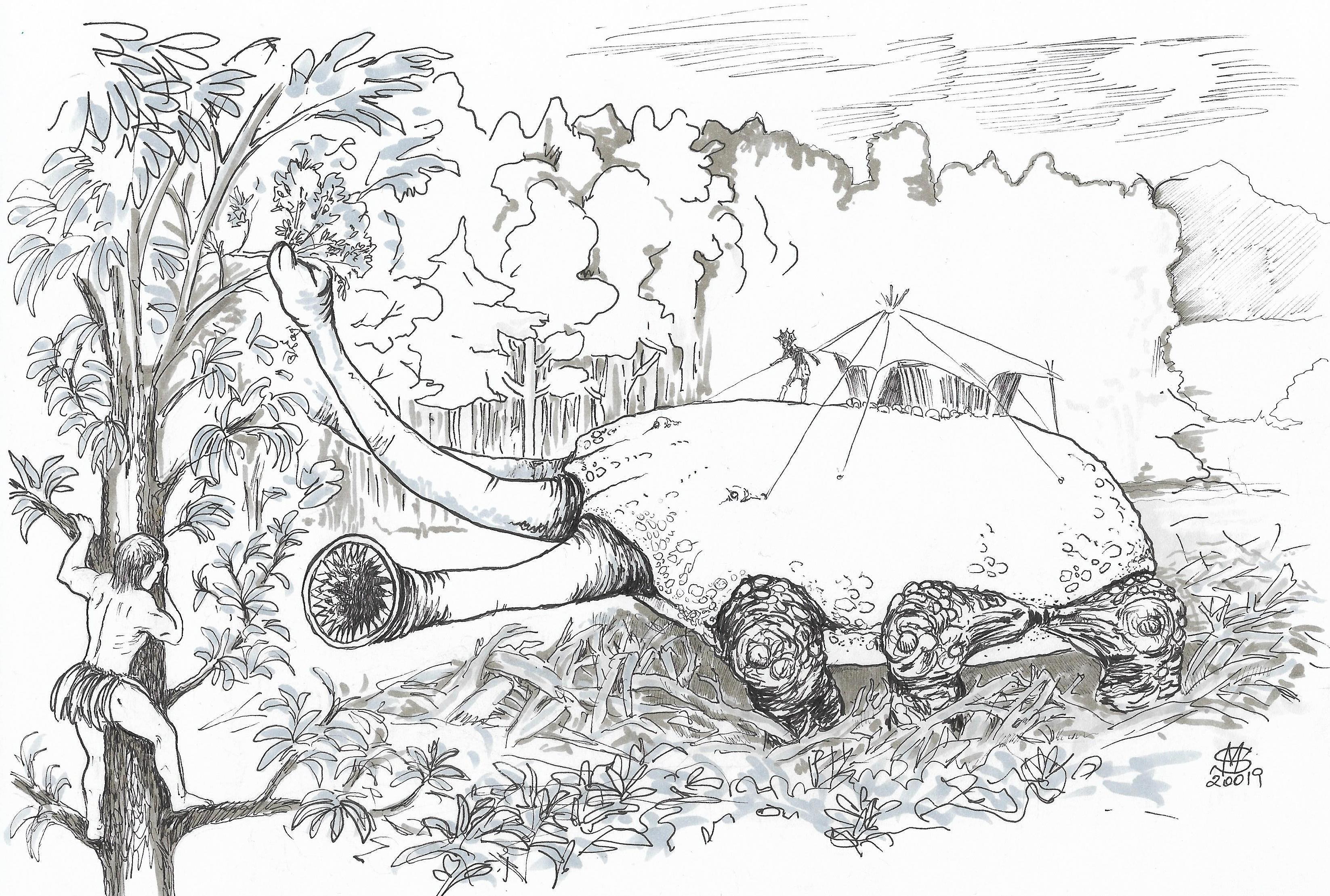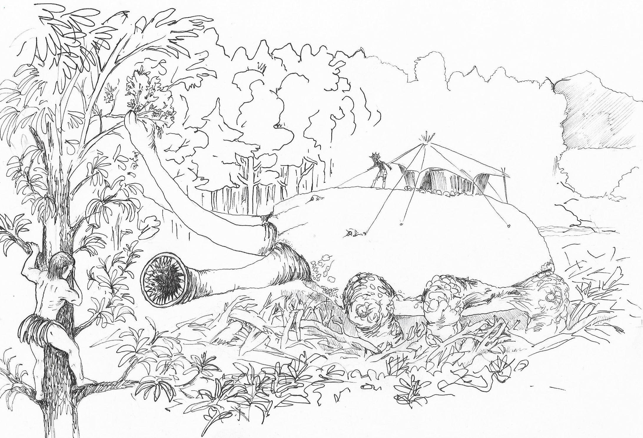 Автор: Marika StanovoiДа. давно-давно я пообещала нарисовать пылесос на 6 ногах и с тремя шлангамэ слонокраба с тентаклями... тварь которая кушает лес...И возит на спине халупку с простынёй... В общем техзадание было страшное и ужасное. Главное, зыверюга большая и идет, лес жует, пни и коряги разбрасывает. И как ее рисовать - неизвестно, потому что я люблю рисовать нечто висящее в нигде. А тут надо грунт, ёлки-палки и всякое такое что я не люблю.