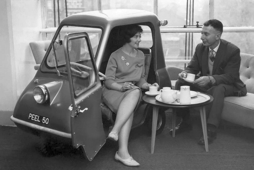 Сначала впереди было одно колесо, а сзади – два. Потом решили это дело подправить и одинокое колесо переместили назад – машинка сразу стала устойчивее на поворотах. «Седан по цене мопеда!» провозгласила «Peel Engineering Company» и граждане стали это покупать: