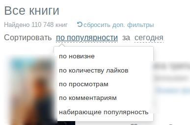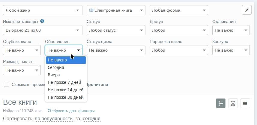 Мы видим что книги можно отфильтровать по дате обновления не позднее чем за месяц. А ещё книги можно отсортировать по популярности за.... сегодня, неделю, месяц, год.