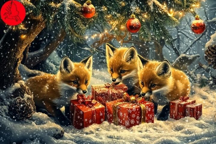 Трое лисят крутилась вокруг подарков. Ёлка сверкала в свете звёзд, припорошенная снегом, аккуратные коробочки стояли прямо под нижними ветвями.