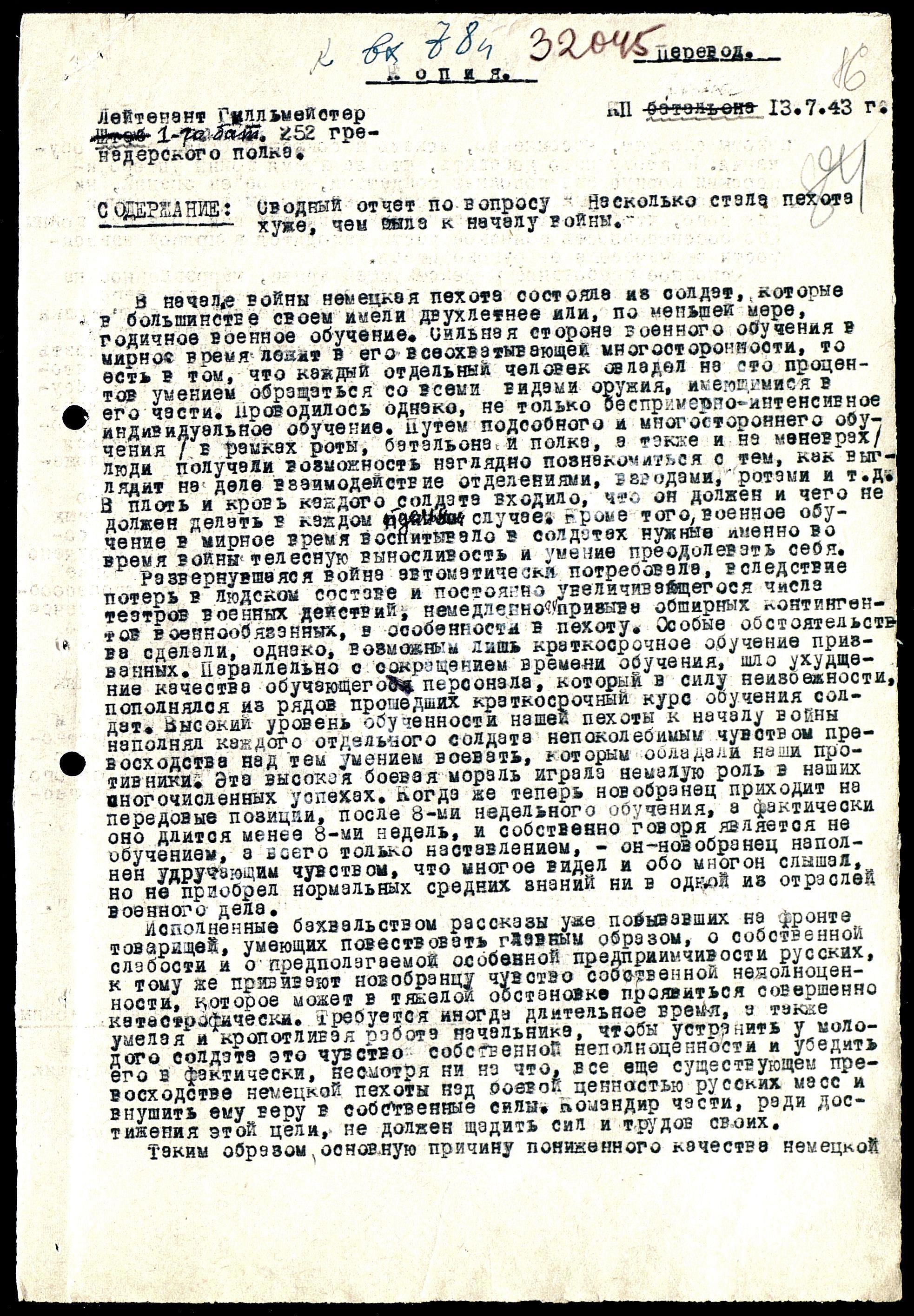 Извиняюсь , но машинописного текста не было. Оно и немудрено, не настолько важная информация чтобы её дальше передавать. А с бумагой дефицит, переводы очень многих дел отпечатаны на оборотах трофейных, непригодившихся карт.