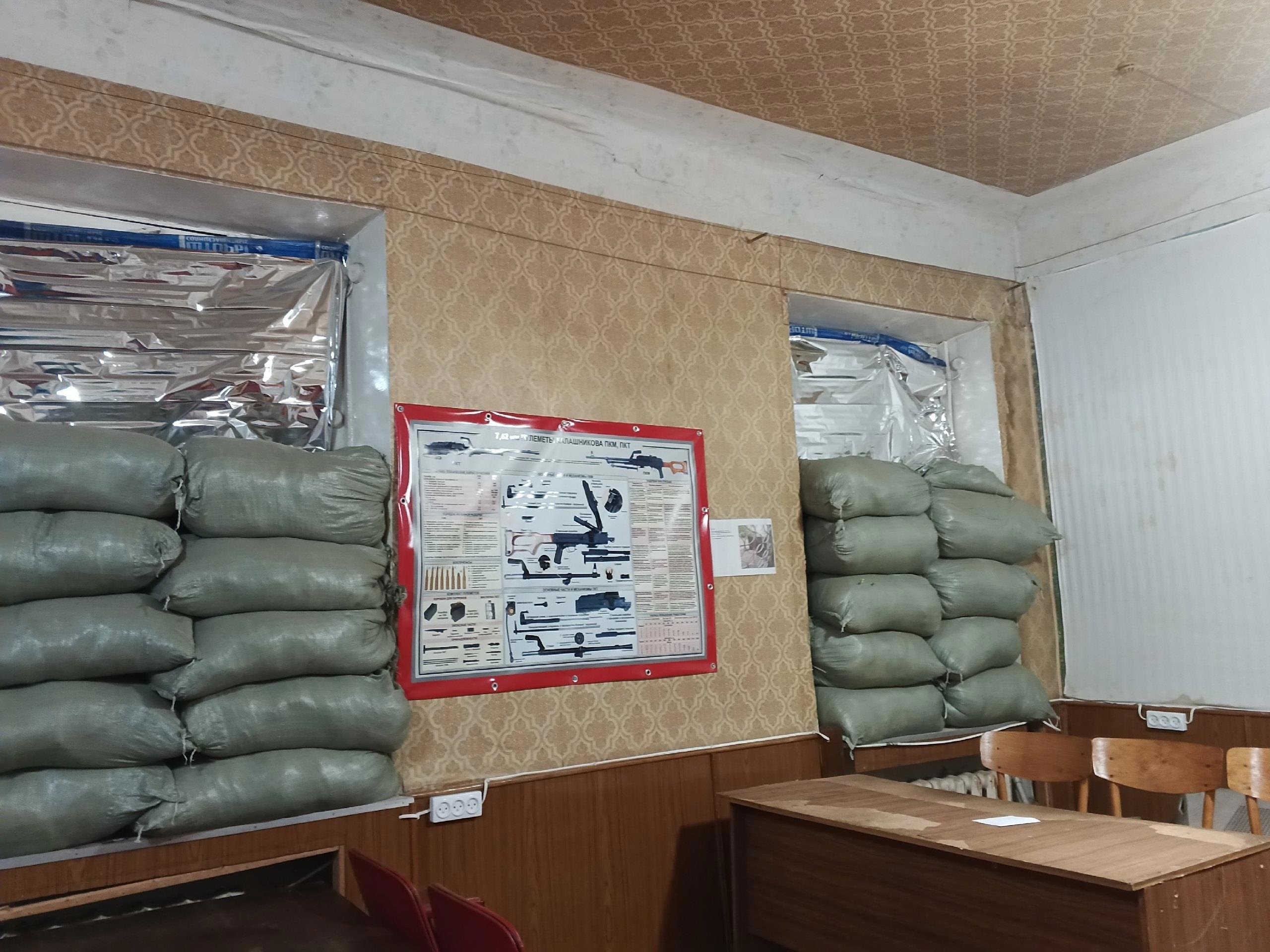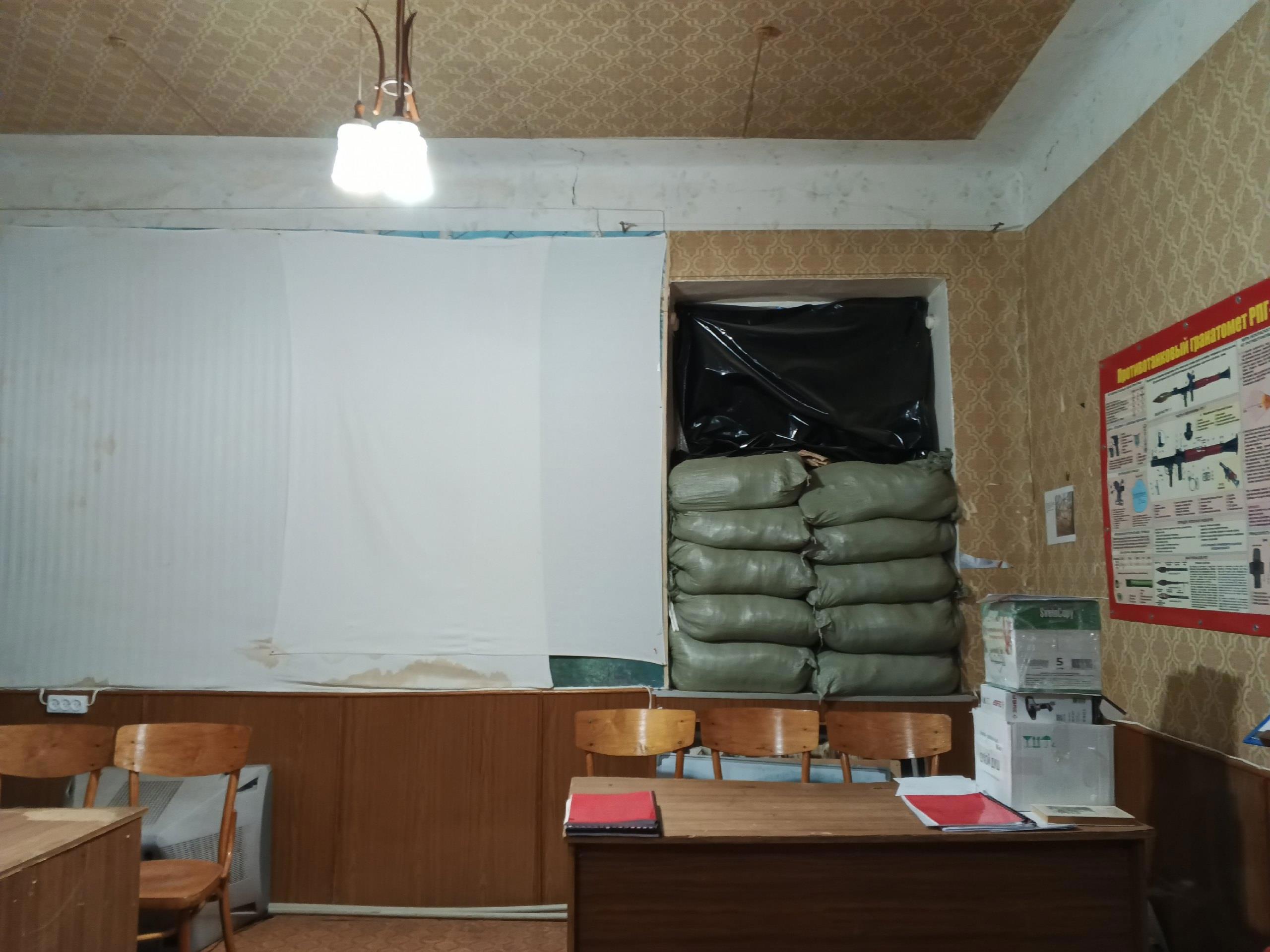 Окна заложены мешками с песком, потолки и стены в трещинах от регулярных артналётов.