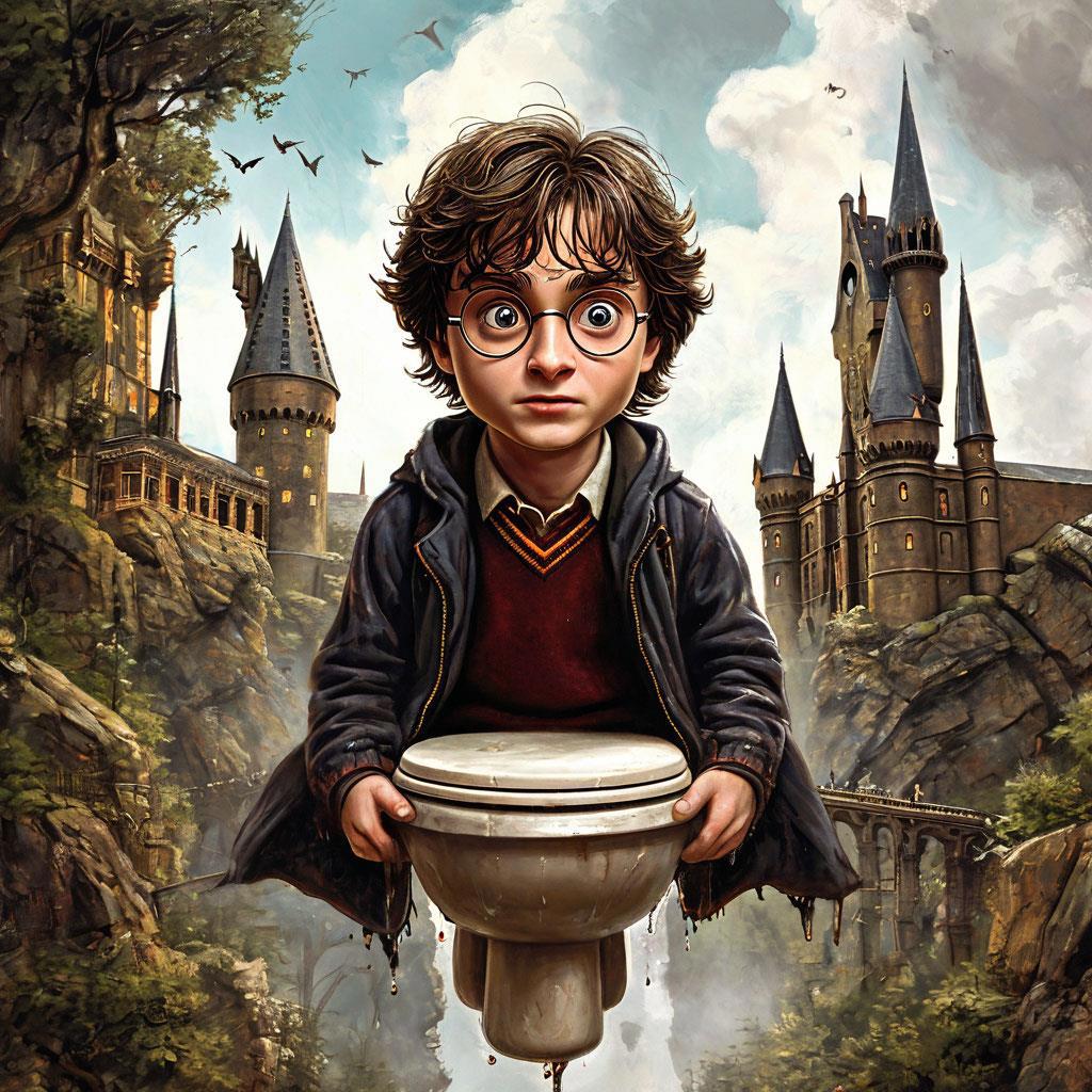 Гарри Поттер, целующийся с Гермионой, получился сразу. А с Волдемортом? Не-а. Менял Волдеморта на Волан де Морта (не знаю, как правильно, ибо книг Роулинг не читал и не планирую), изощрялся так и этак, а выходило одно: Поттер ни в какую не желает целоваться с Темным магом; вместо этого он целуется со своим клоном. А это похоже на нарциссизм, если не пропаганду ЛГБТ. То ли Шедеврум вообще не знает Сами-знаете-кого (что вряд ли), то ли злым волшебникам, по мнению этой нейросети, не дозволено покушаться на святое. Тогда я решил задать что попроще: "Гарри Поттер летает на унитазе". Получил картинку: сидит на унитазе, но не летает. Даже низЕнько. Пришлось добавить: "над Хогвартсом". Вышло тоже так себе, но хоть в первом приближении то, что заказано: