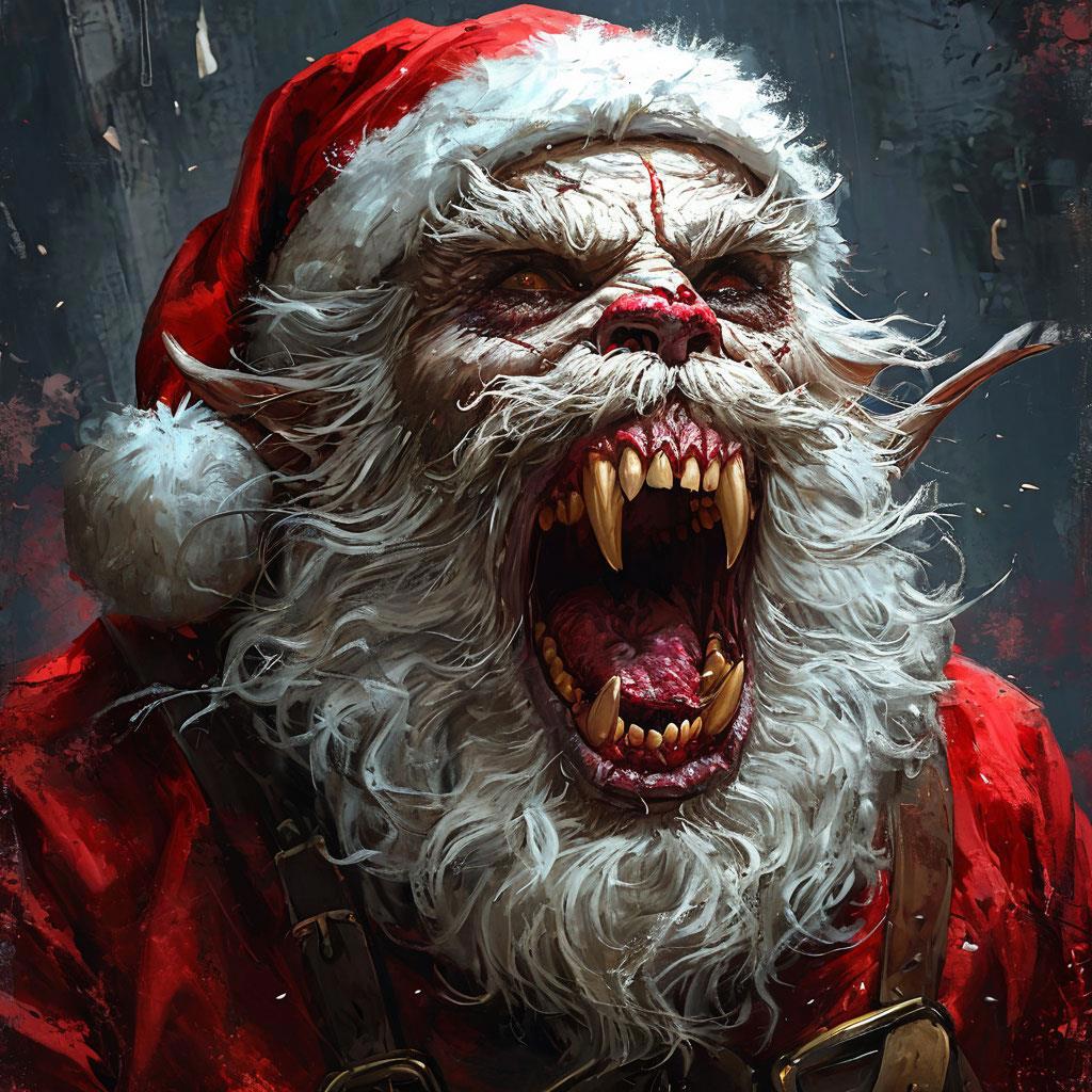 Тут я уже начал сердиться и заказал злого Деда Мороза. Вышел до отвращения добрый. Младшая внучка посоветовала внести словечко "вампир". Внес. Дед Мороз посерьезнел, но и только. Добавил "скалит клыки" -- персонаж раскрыл рот с очень хорошими, но совсем не вампирьими зубами. И только когда перед словом "клыки" я вставил "саблезубые", получилась картинка, примерно соответствующая запросу: