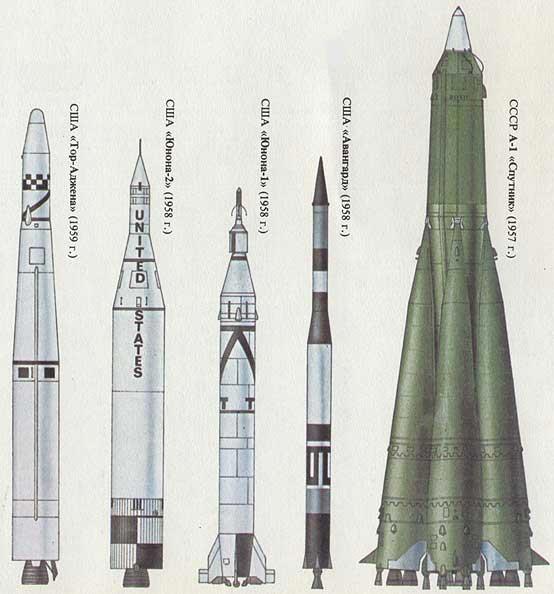 На рисунке вы можете сравнить размеры первых космических ракет. Правда тут незаслуженно забыли «Атлас» полетевший в 1958. «Юнона-1» — тот самый «Редсоун», форсированный и оснащенный второй, третьей и четвертой ступенями собранными из твердотопливных неуправляемых ракет в лучших традициях Kerbal Space Programm: