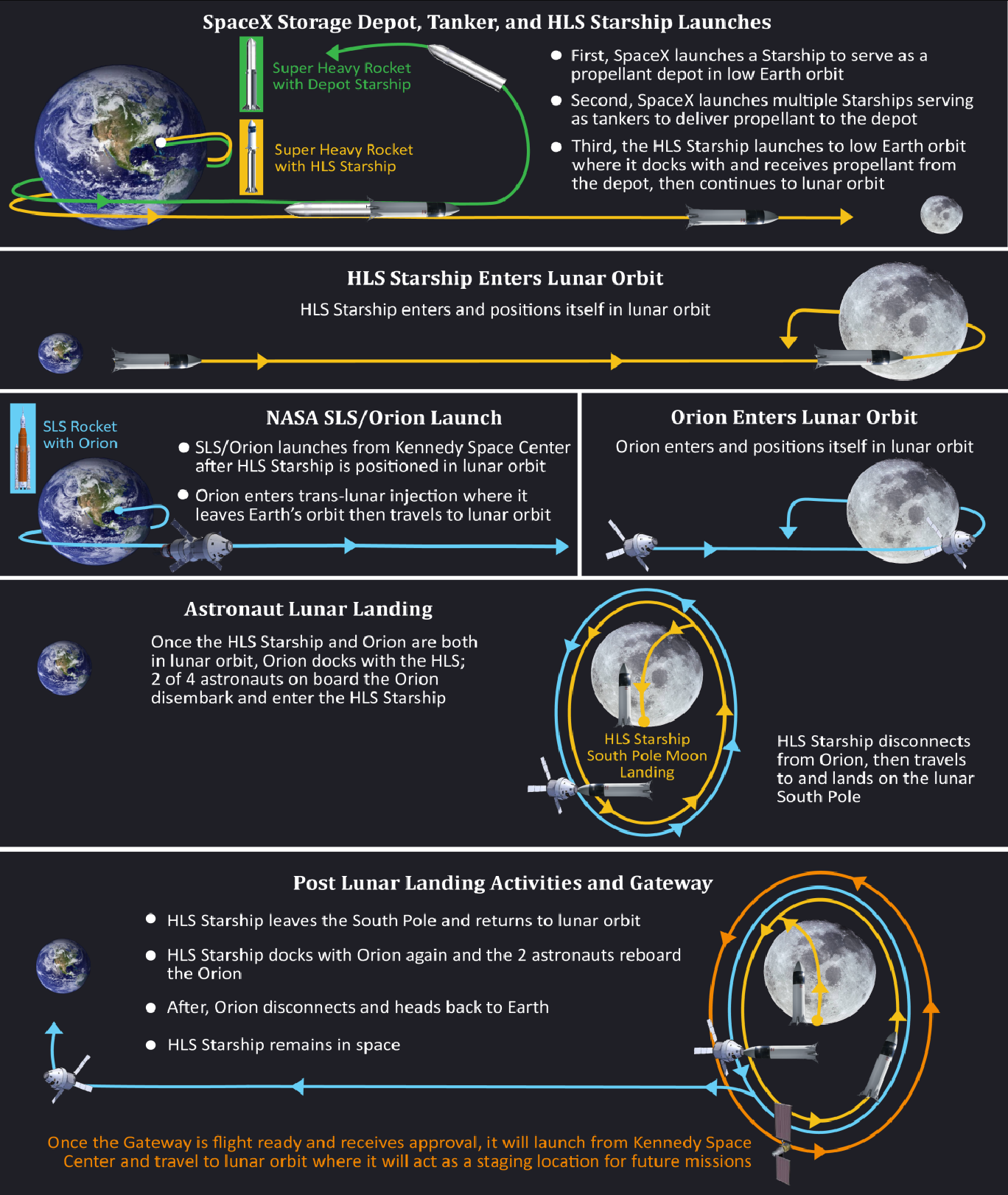 Тем временем разработка программа «Эксплорейшн» стала «Артемидой». В процессе переименования выяснилось что затраты на переделку «Шаттла» в «Сатурн-5» силами Боинголокхида NASA с трудом, но тянет, а вот на окололунную орбительную станцию, корабли ее снабжения и корабль для высадки на Луну деняк уже нет. И опять было решено обратиться к коммерческим контрактам с фиксированной стомостью для всего кроме SLS и Ориона. И тут Маск затроллил NASA отправив на конкурс посадочных кораблей «Старшип». На котором он победил ибо приличного повода завернуть корабль который уже есть хоть в каком-то виде и за который просят меньше чем у конкурентов у комиссии не было. В результате получалось что отважные астронавты должны будут стартовать с Земли на SLS чтобы на окололунной орбите перейти в «Старшип», на котором уже на Луну высаживаться: