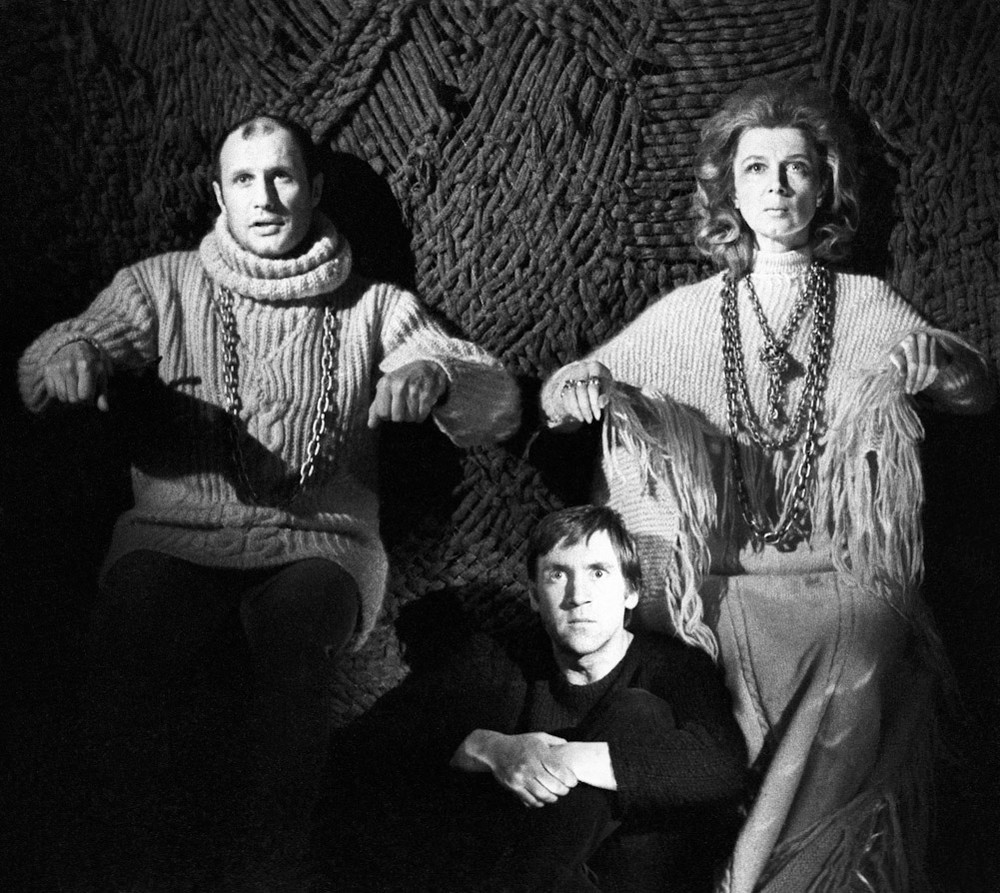 Александр Пороховщиков (Клавдий), Алла Демидова (Гертруда) и Владимир Высоцкий (Гамлет) в спектакле Юрия Любимова «Гамлет», Театр на Таганке