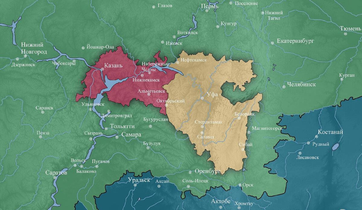 Это сильно усложняет выход из состава России башкирам и татарам, - куда бы они не выходили, они, в любом случае, будут окружены Россией.