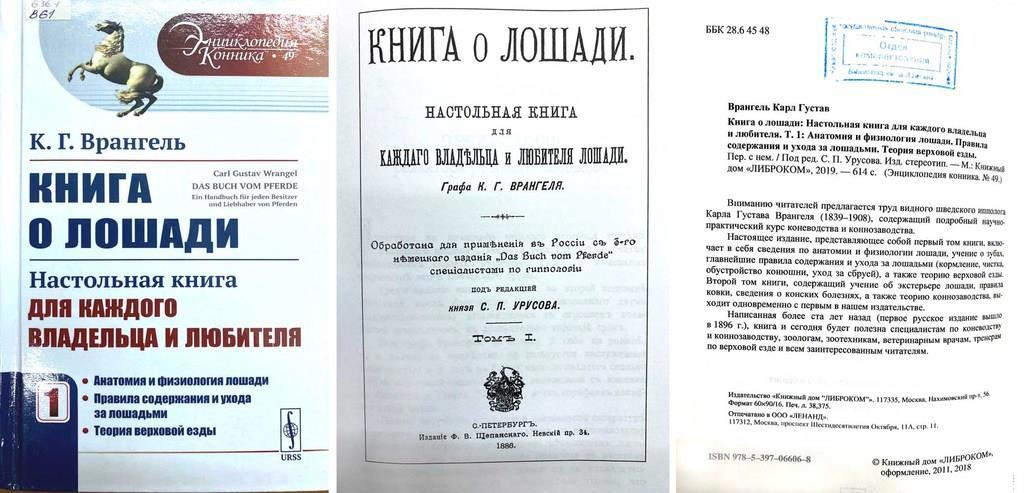 Две книги, о которых я хочу вам сегодня рассказать, связаны между собой. Первый труд о лошадях — «Книга о лошади» графа Врангеля. Нет, это не тот Врангель, о котором вы подумали. Карл Густав Врангель был шведским иппологом. Подзаголовок его труда назывался «Настольная книга для каждого владельца и любителя лошади». В 1890-х годах впервые вышел русский перевод книги.