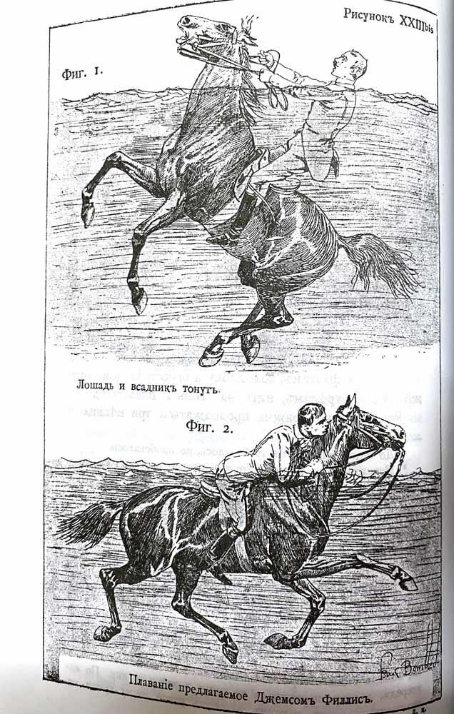 И эта особенность тоже делает книгу интересной не только для любителей лошадей и верховой езды, но и для писателей. К примеру, руководство, как правильно всаднику переплывать верхом водную преграду, чтобы не утонуть. Наглядно и полезно. Чтобы потом не писать в художественных произведениях откровенные нелепости.