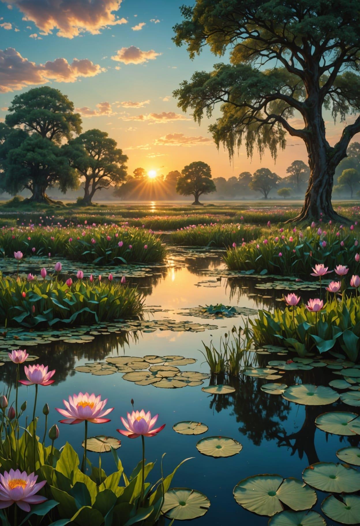 2: Beautiful Sunrise over a field of flowing grass, pond with water lilies and lotus flowers, colorful flowers, large tree, Warwick Goble, Erin Hanson, Stephanie Law