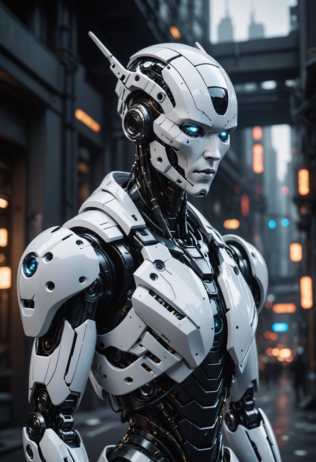 1: white porcelain skin, futuristic cyborg robot, dark background