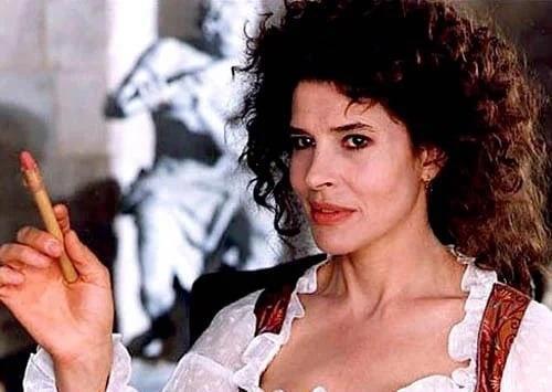 Все вопят, бегают, богохульничают, кого-то щиплют за аристократические прелести с обжорными мясами, полицаи орут про Дидро, ихний фельдфебель вламывается даже в, ужас какой, часовню, где маркиза как-то её там с греховно-прекрасно-глазасто-губастым ликом Ариэль Домбаль, предаётся молитвам, вся такая в шляпке, корсете, гневно трепыхающихся персях поверх оного и в огромных юбках на конструкции из китового уса. Палачи свободы смущаются, миль-пардонят и винтят на выход.