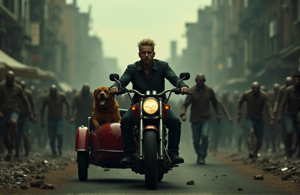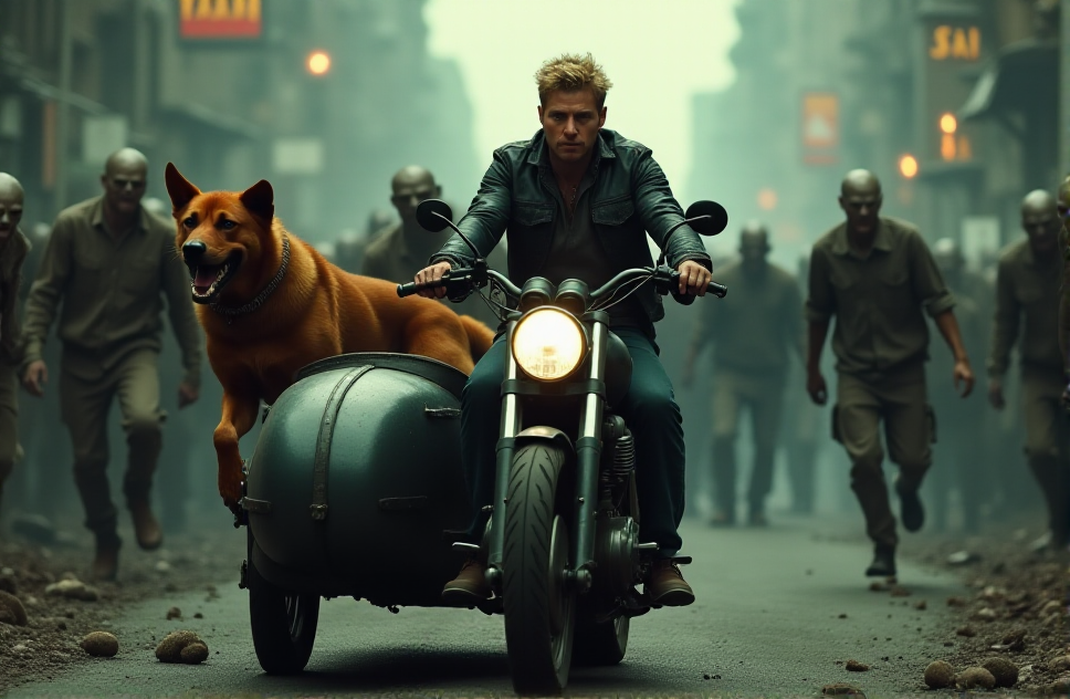 Хотите мрачный арт с мужиком на мотоцикле, с собакой, уезжающими от толпы зомби? Легко.