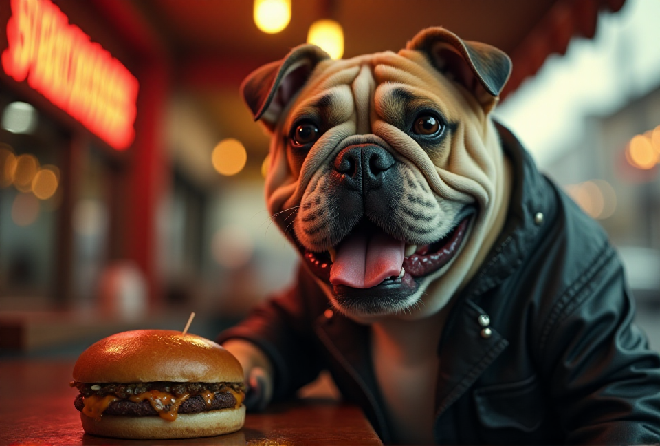 Счастливый бульдог в кожаной куртке, в баре, с бургером