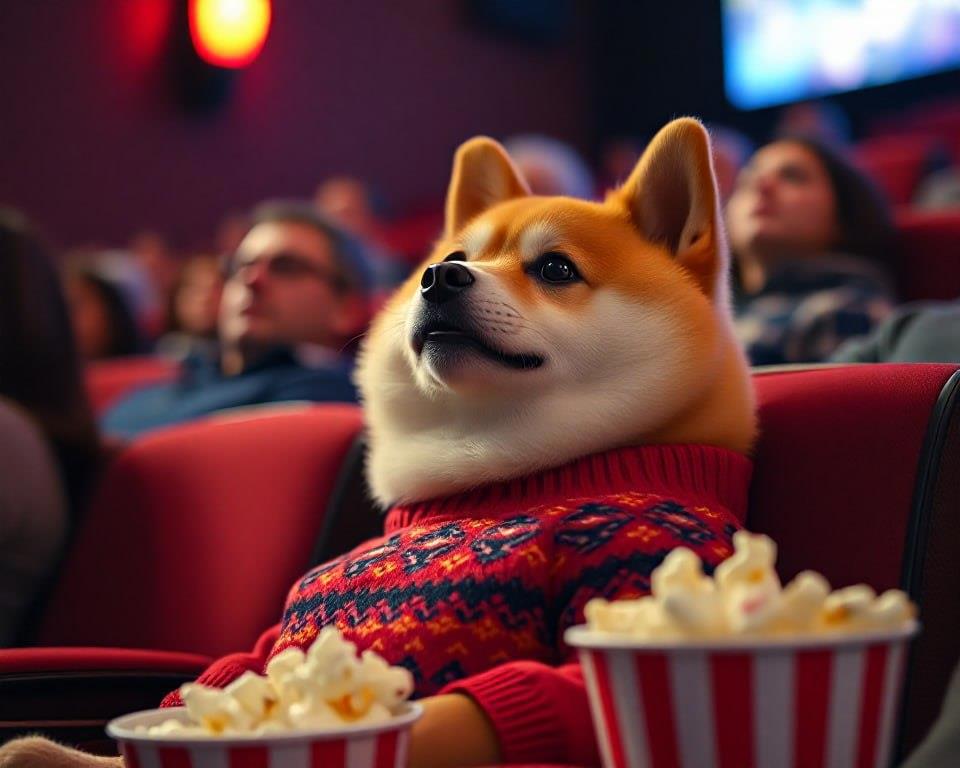 Шиба в свитере, в кинотеатре с ведром попкорна.