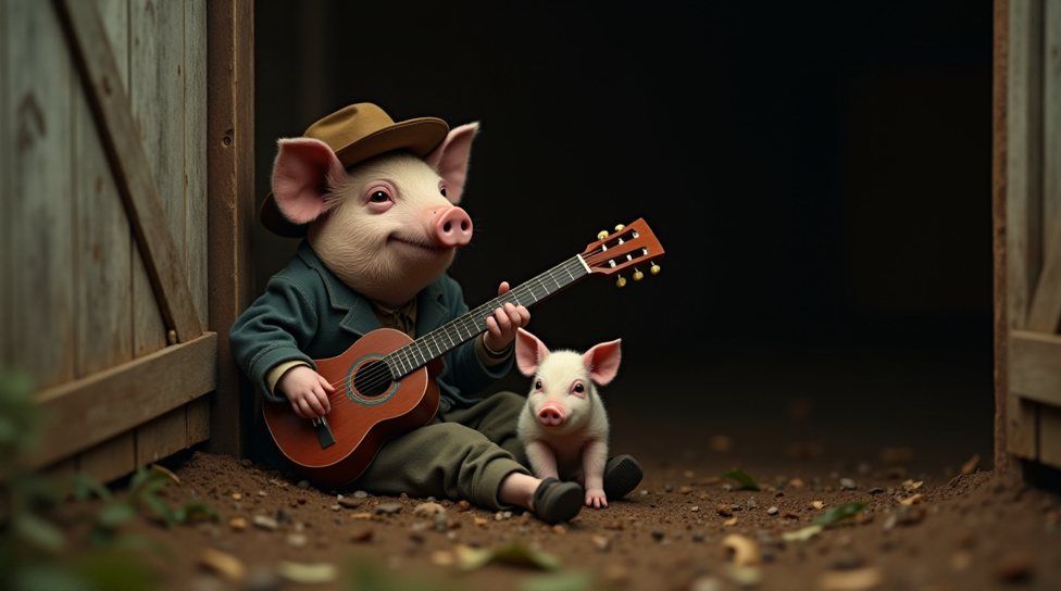 Давайте что-нибудь поинтереснее. Например антропоморфная свинья в шляпе и с гитарой, сидит оперевшись на стену амбара, рядом с ней поросенок.