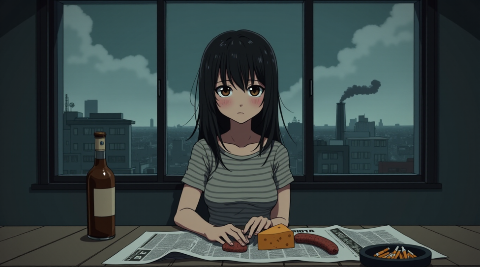 Собака алкашка в тельняшке, с бутылкой коньяка и закуской на газетке: