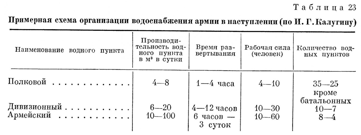 В наступлении на уровне полка развертывалось примерно 1-2 пункта водоснабжения, около двух на уровне дивизии, и ещё 4-8 пунктов водоснабжения в армейском тылу. Таблицу из интернетов прилагаю.