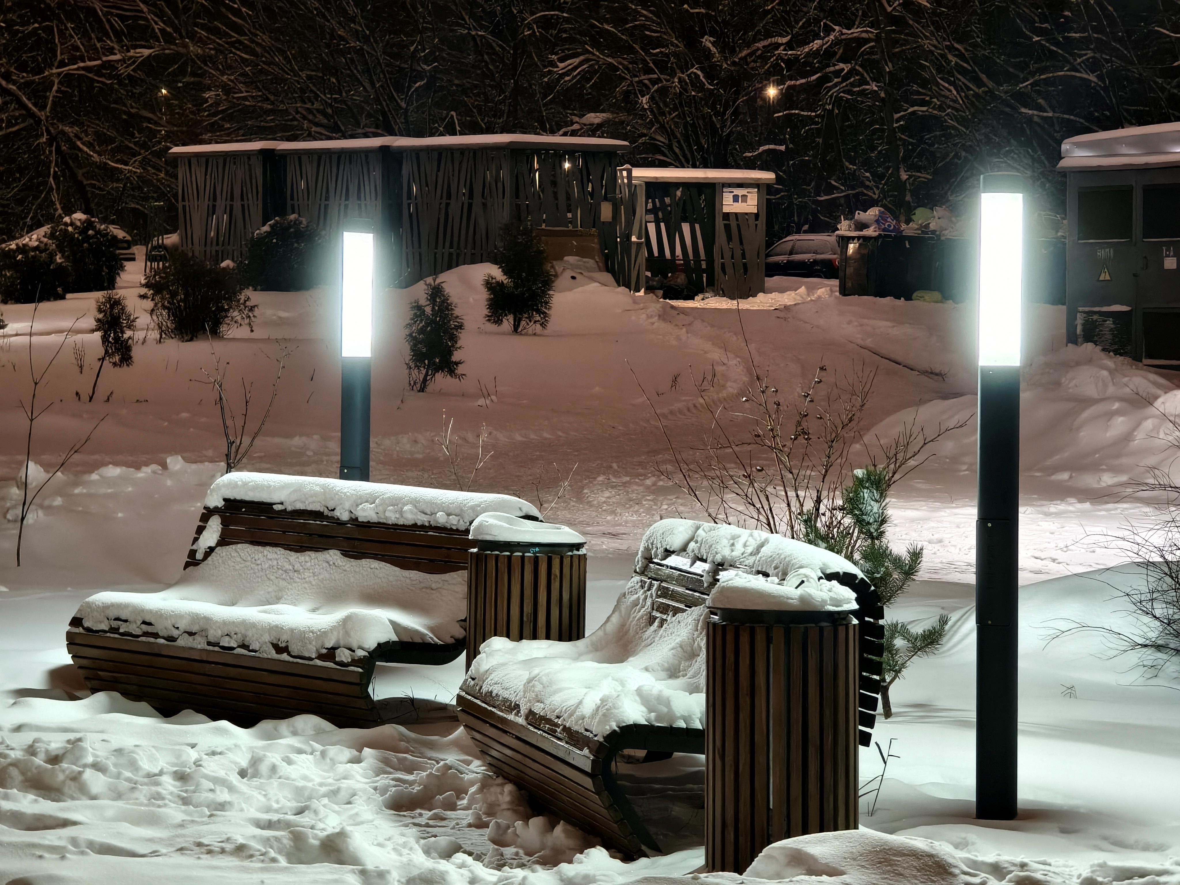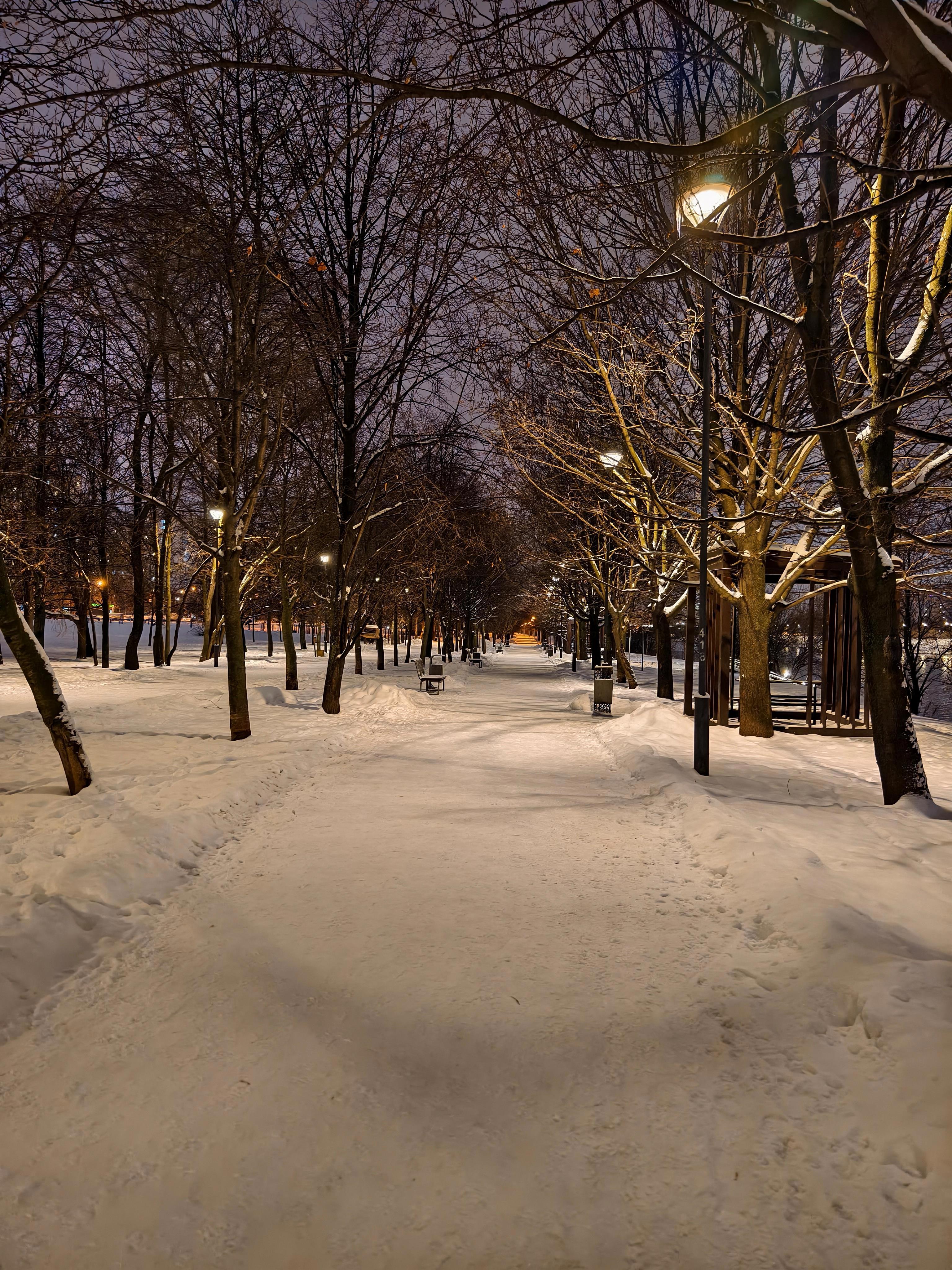 На улице метёт, а значит пора прогуляться ..вечером. Нормальные люди в такую погоду по домам сидят. Однако, как только мы с супругой вышли из дома, то снег прекратился. Стало очень даже романтично.