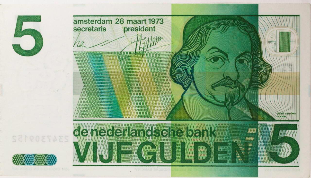 На пяти гульденах изображен творческий человек, создатель национальной трагедии классицизма. Писал он, конечно не только трагедии. Беря за основу исторические и библейские сюжеты, он писал стихи, драмы и даже сатиры. Представлением его трагедии "Гейсбрехт ван Амстел" открылся первый государственный театр Нидерландов.