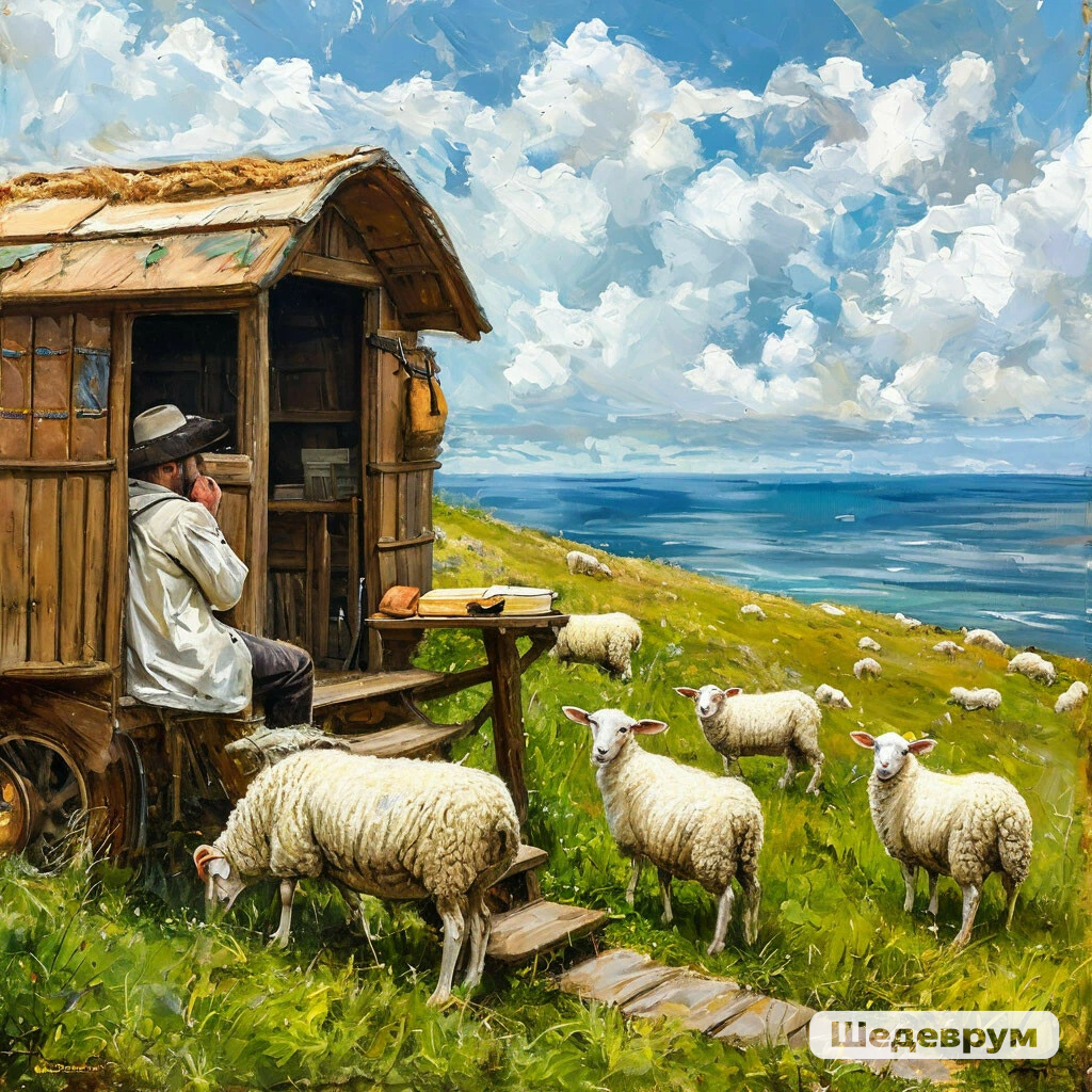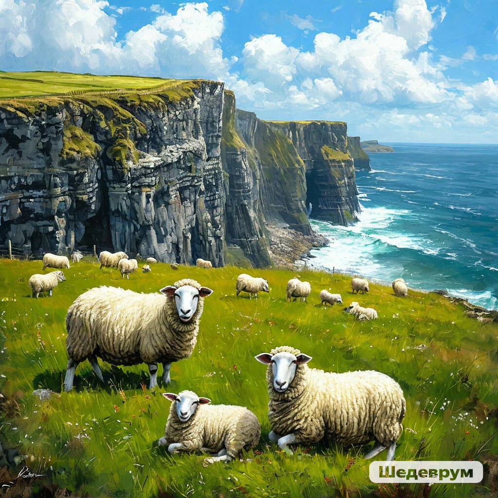 На зеленом лугу с сочной травой, на краю обрыва между небом цвета моря и морем цвета неба пасется стадо овец древней ирландской породы. Одна из овец забралась на высокий утес в отдалении и лежит на краю обрыва. Возле овечьего загона стоит пастуший фургон, на крыльце которого курит пастух с книгой в руках.