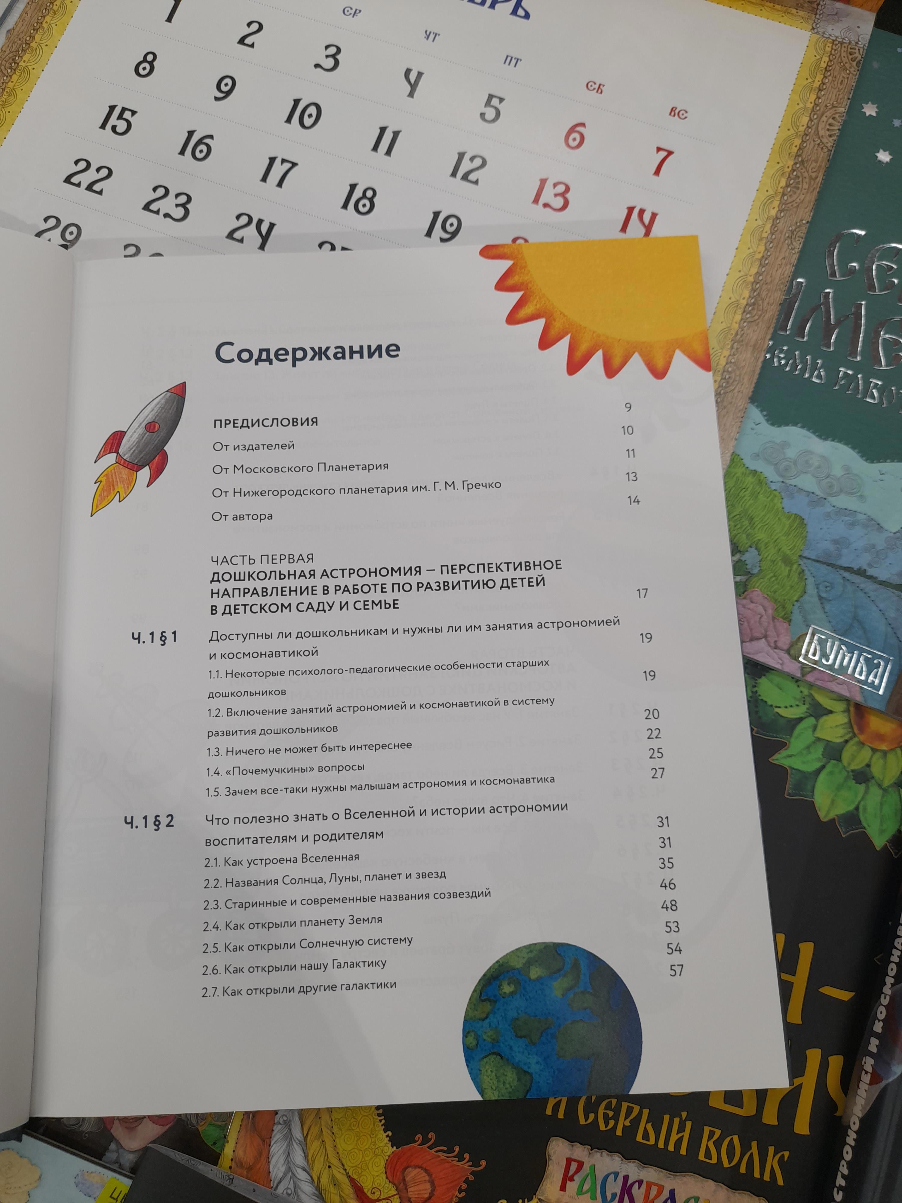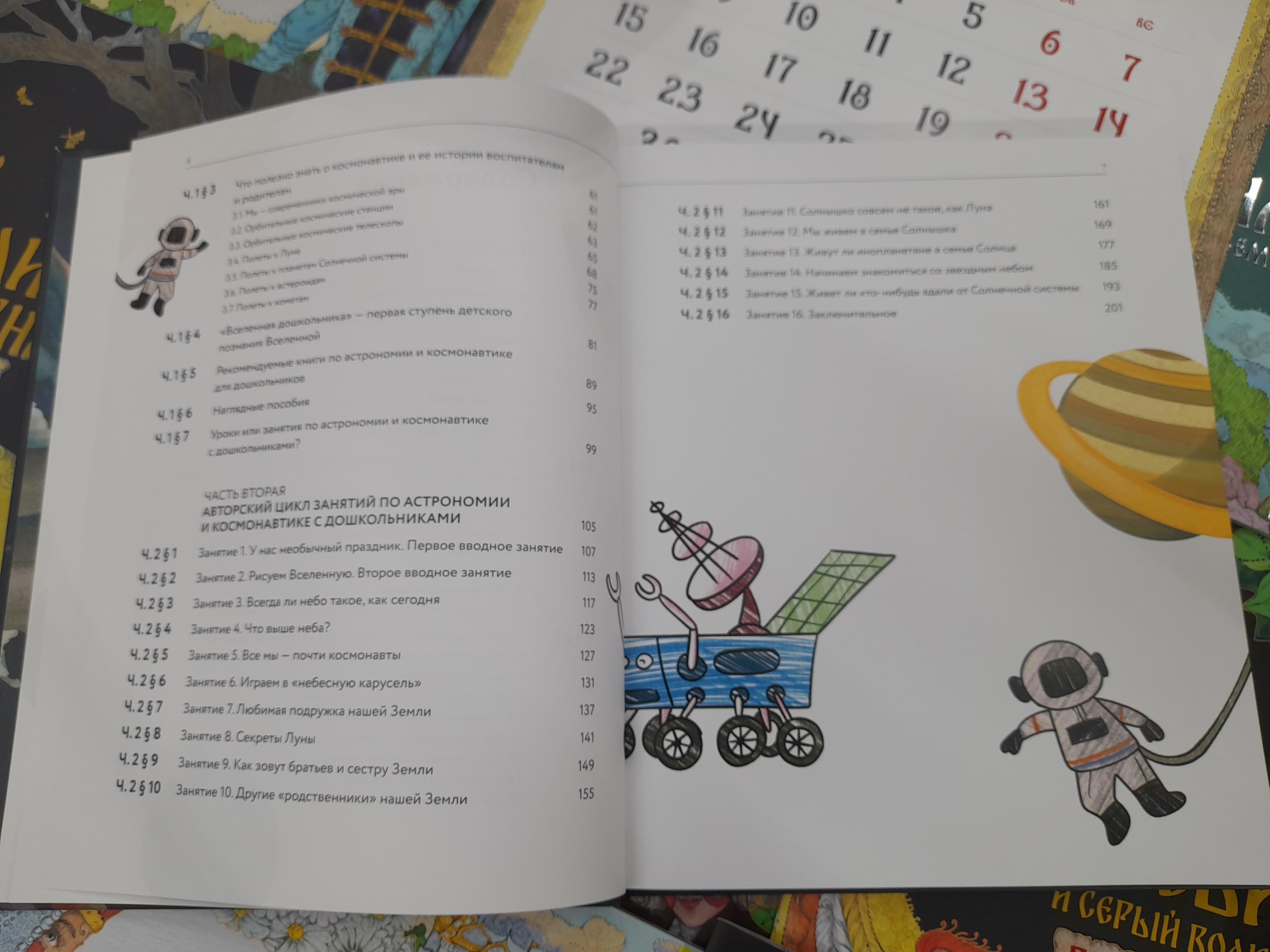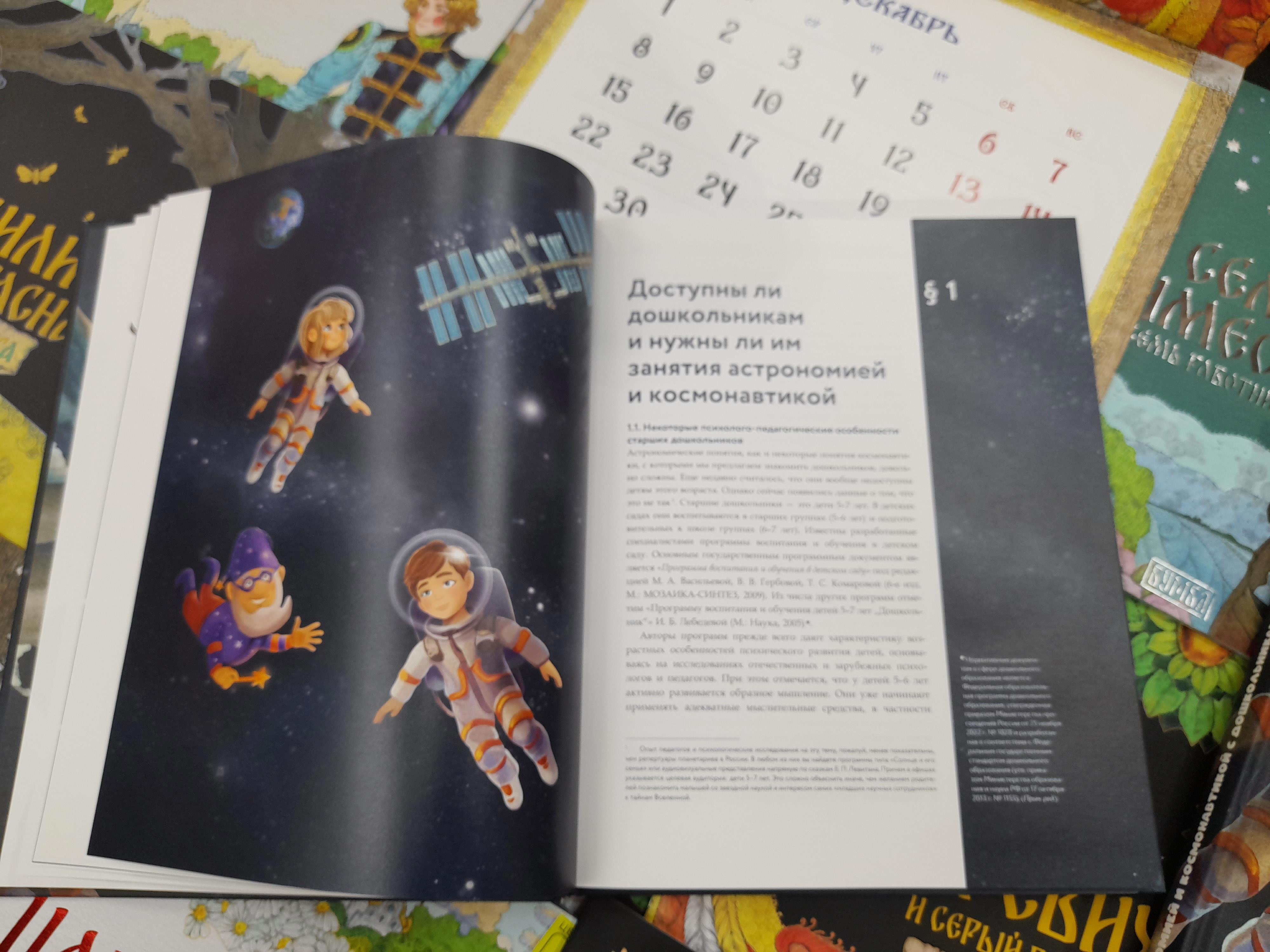 Итак, книга про то, как рассказеть детям просто про сложные вези о космосе и ответить на их вопросы. И рассчитана в первую очередь на самый сложный возраст – дошкольники и младшая школа. Может быть – начало средней школы, но тут надо будет уже дополнительно поработать самому учителю. С очень хорошей подборкой как иллюстраций, так и фотографий научного материала. И можно сказать разбита на три «учебных линии». Это серия историй про героев-детей, которые сталкиваются с разными космическими явлениями. Например – а что такое вообще космос? Это готовые схемы и заготовки занятий. Настолько хорошо сделано, что вот открывай на нужном месте и с листа веди урок. И практический материал.