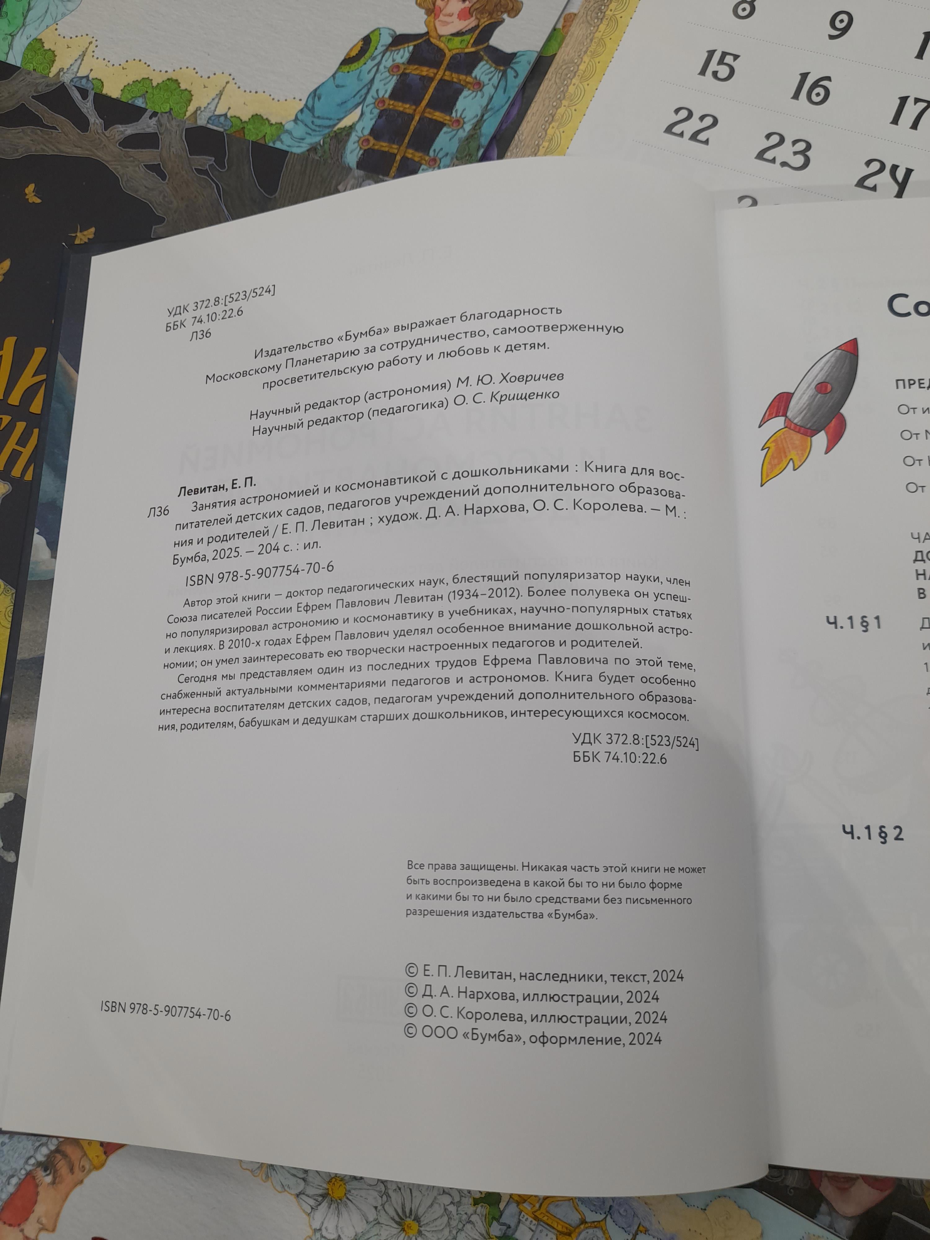 Говорят, если долго смотреть в космос – он посмотрит на вас. Но если не отвести взгляда и не испугаться, то космос поделится в ответ своими тайнами. Полвека назад, когда едва началось освоения космоса – были другие люди, которые и смотрели в далёкую черноту иначе. И мысли у них были – великие. В конце ХХ века про космос начали забывать и остывать, но последние лет десять снова про космос вспомнили и про него заговорили. Но – по-другому. А ещё мы начали рассказывать про космос детям, чтобы они всё-таки сделали следующий шаг. И потому сегодня редкий для меня случай: я хотел бы посоветовать книгу не как читатель другому читателю (взрослому или ребёнку), а как взрослый посоветовать книгу родителям и учителям. И конечно же книгу необычную, хотя, наверное, надо сказать невозможную – но вот она есть у меня в руках. «Занятия астрономией и космонавтикой с дошкольниками» Левитан Ефрем Павлович. Почему невозможную? Дело в том, что Ефрем Павлович – это тот самый голос из прошлого, когда люди рвались осваивать Вселенную. Учёный, педагог и писатель. Заместитель главного редактора журнала «Земля и Вселенная», регулярный автор статей для журнала «Наука и жизнь». Автор школьного учебника астрономии, по которому учатся до сих пор. Нескольких книжек для детей... Один из тех, кто умел говорить про астрономию и со взрослыми, и с детьми.