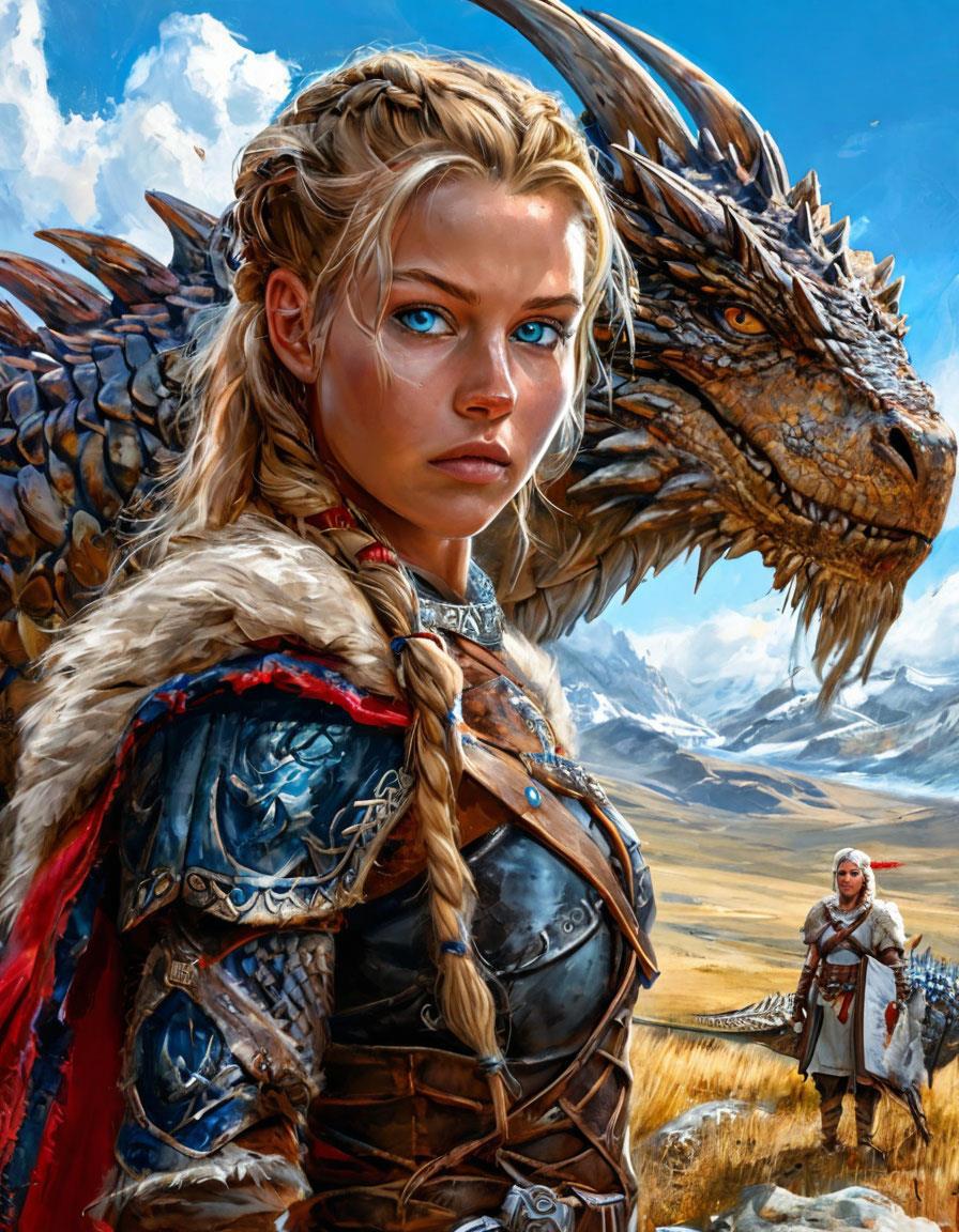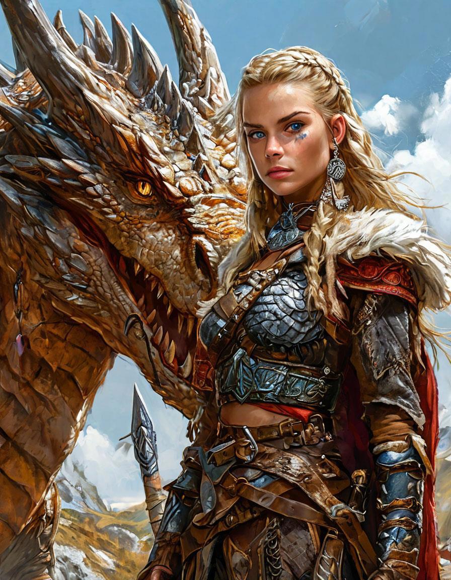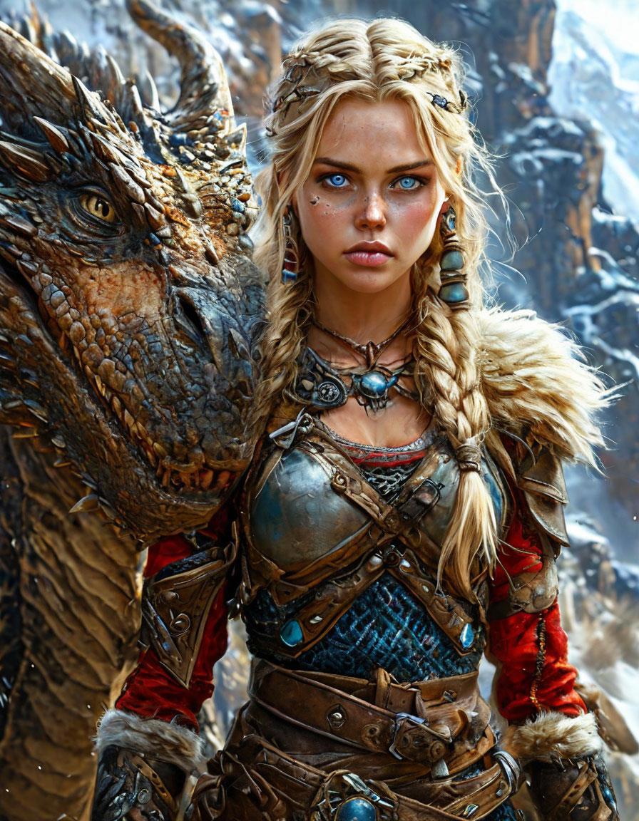 a beautiful viking girl in battle gear with blue eyes stands next to a full-grown dragon in different locations