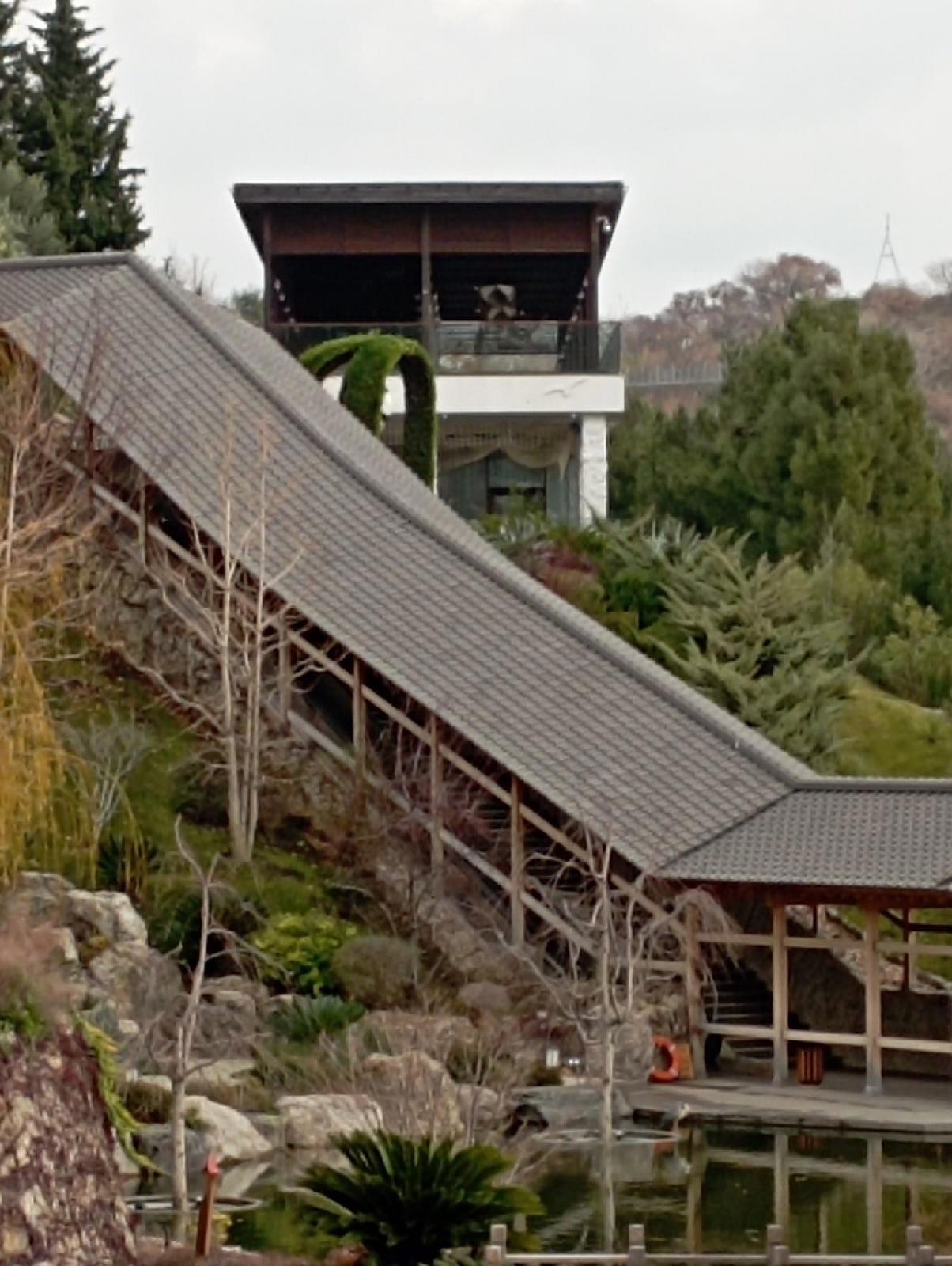А вот этот крытый переход, с удобным фуникулёром закрыт для гостей Японского сада. Именно здесь нас встретил охранник, внимательно осмотрел браслеты, которые нам выдали как гостям, и вынес вердикт, что нам запрещено гулять где-то вне садика... Поэтому пришлось возвращаться по тем же страшным ступенькам, топать по мостикам, которые уже не вызывали особого удовольствия, а потом мы обломались ещё раз. Если от ресепшена нас до садика довезли на маленьком гольфмобиле, хоть и без окон и с мокрыми от тумана сиденьями, но довезли. А вот назад шли пешком. Видимо в этот момент мы перестали быть гостями.