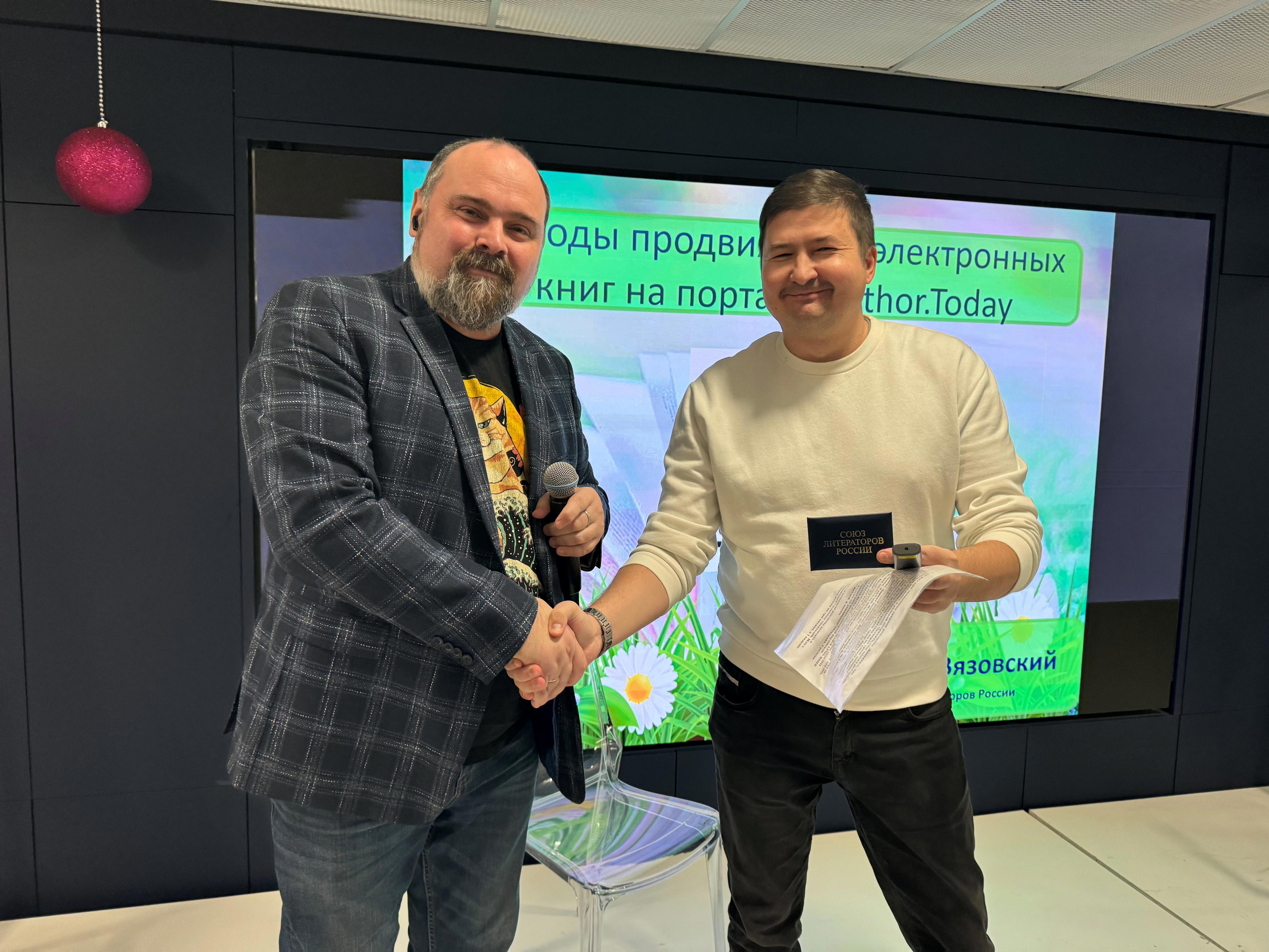 — За ними Алексей Вязовский выступил с важной для писателей темой: методики продвижения книг на Author.Today. Алексей разобрал бесплатные и коммерческие способы продвижения и показал, какие метрики являются ключевыми при сборе статистики в первые дни, поделился личным опытом и кейсами с цифрами. А еще на сцене провели торжественное вручение удостоверения члена Союза Литераторов РФ Алексею от руководителя Союза Николая Калиниченко.
