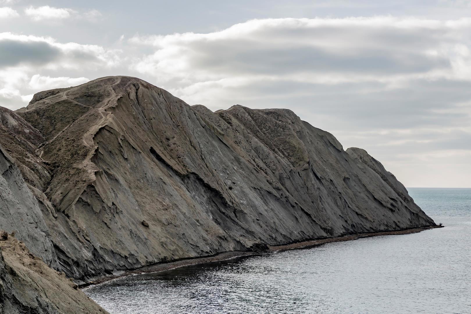 Топрак-Кая (Топрах-Кая) - глиняная скала по крымскотатарски, Лагерный мыс, мыс Хамелеон. Этот мыс напоминает лежащего в море дракона, который выставил на солнце свой спинной гребень и наслаждается теплом.