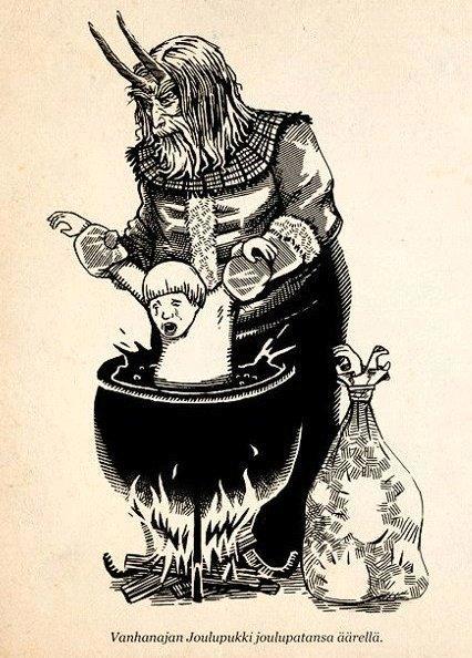 Финская надпись гласит: «Старый добрый Йолупукки у своего рождественского котла»… Ну что, у кого поднимется рука написать под рисунком «Финский дедушка Мороз, он подарки нам принес, в мешке…» А в мешке-то не подарки, а живые дети…