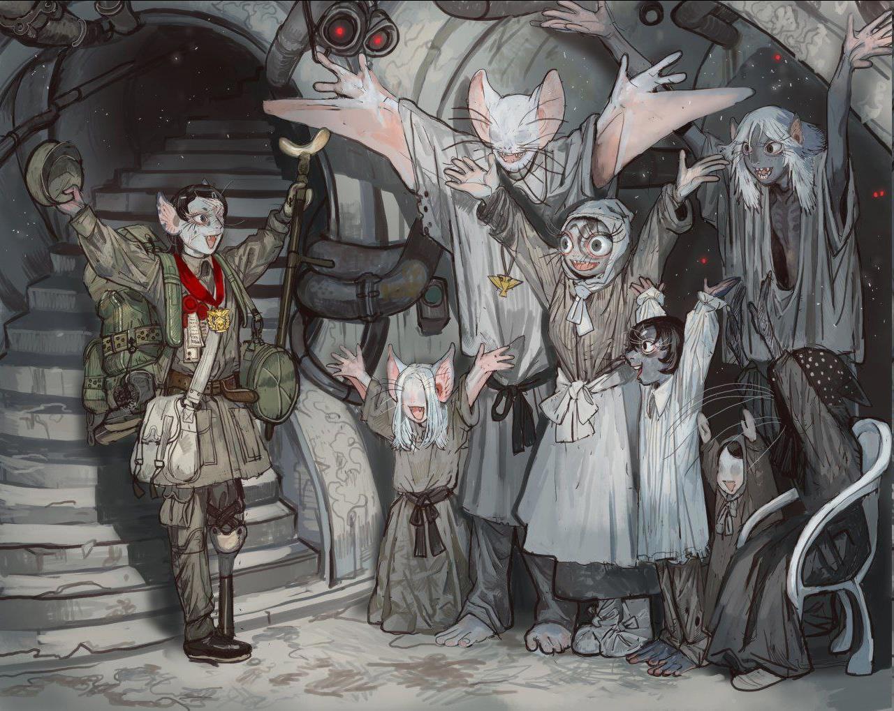 Я тогда ещё писал, что мне особо понравились длинная космолётчица и девочка-бетмен из подземножителей. И как в воду глядел - первым делом автор запилил ещё картинок с длинно-лётчицей (и фанарт по ней пошёл сразу). А второй добрался и до летучемышки. Автор любит рисовать всякую жесть, но тут выдал вдруг такое вот - мышка отслужила и вернулась к родне с орденом, что для абхумана в Вахе особое достижение. Кое-что пришлось отдать родине, но это ж ваха, аугментика там вполне доступна (тем более мир явно не аграрный и не средневековый). Приделают модный красный глаз, как у одного комиссара, да ногу железную получше.