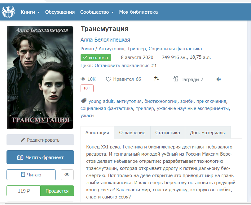 И в честь получения третьей рецензии на роман "Трансмутация" будет действовать скидка 35% в течение трех дней: 19, 20 и 21 декабря. А бесплатно прочесть первую часть романа можно здесь. Главный герой хотел осчастливить человечество, а вместо этого вызвал появление сотен тысяч безликих зомби. Правда, как справедливо указывает Ольга Дар, в этой книге