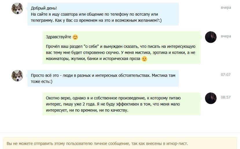 Тема изъезженная, и всё же хочу предупредить об очередной потенциальной опасности. Стучится мне давеча в личку некий гражданин и с ходу предлагает соавторство и всё вот это. Ниже скриншот всего короткого диалога, что у нас состоялся. Как видите по итогу вроде как адекватного общения, я уже пребываю в чс.
