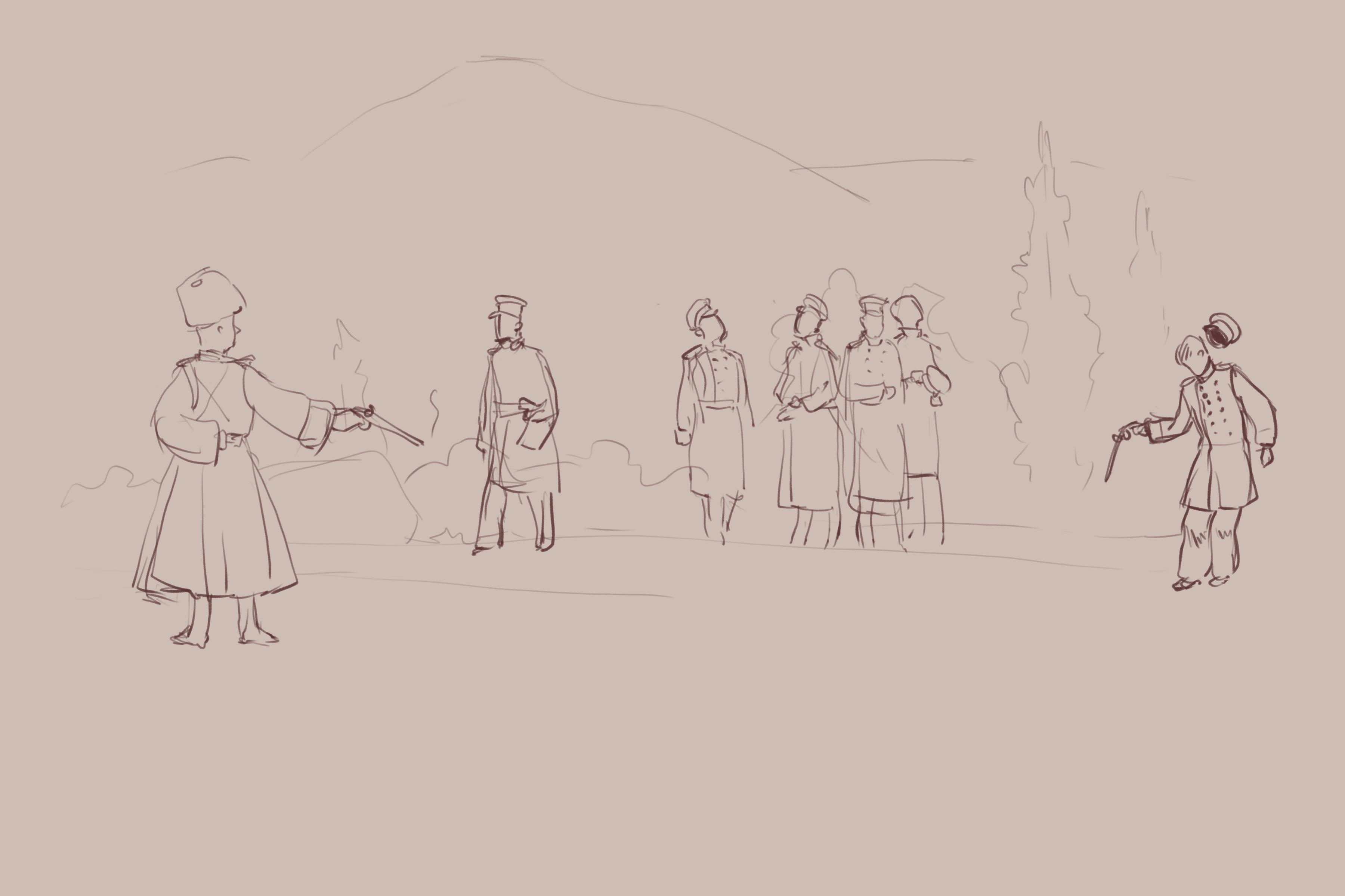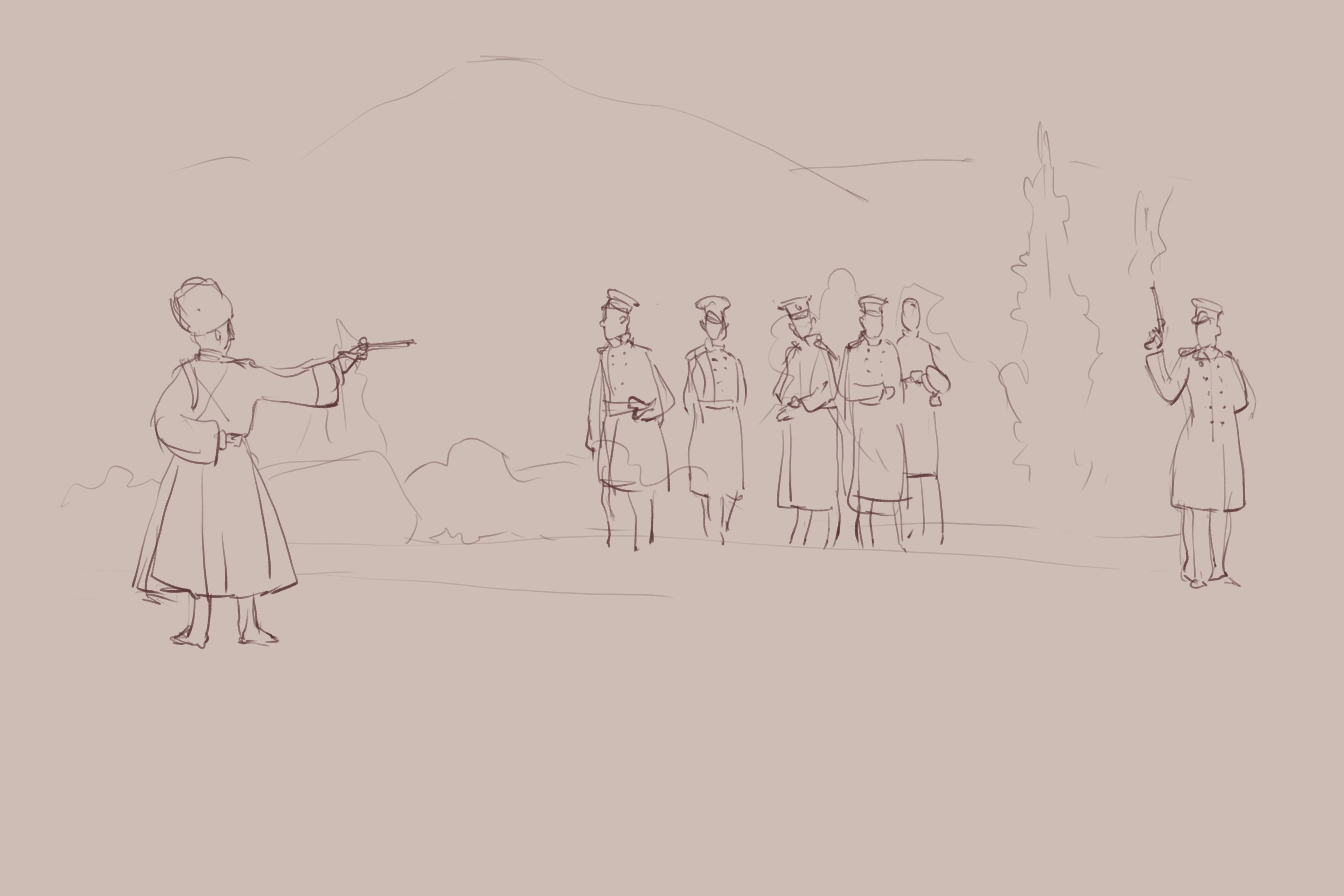 P.S. Конечно, мы не могли пройти мимо дуэли и порассуждать о том, не имела ли тут место провокация. Выдали целую конспирологическую теорию, нагородили бог знает что. И про ревность Николая I, и про участие жандармов, и про выстрел из засады... И чо?! Кто-то вообще знает правду? Вокруг "дуэли местного значения" наворочена такая гора лжи, путанных показаний, домыслов, которая даже не снилась авторам АИ. Даже маститый лермонтовед И.Л. Андроников вынужден был выдумывать фантастические версии типа выстрела от бедра от Мартынова из тяжеленного пистолета Кухенройтера, который чуть не выкручивал стрелку кисть. На такой поляне можно топтаться без страха быть обвинённым сказочником. Для иллюстрации своих фантазий мы прибегли к помощи художника Алекса Прибылова, который сделал нам нечто вроде раскадровки. Вот такие: