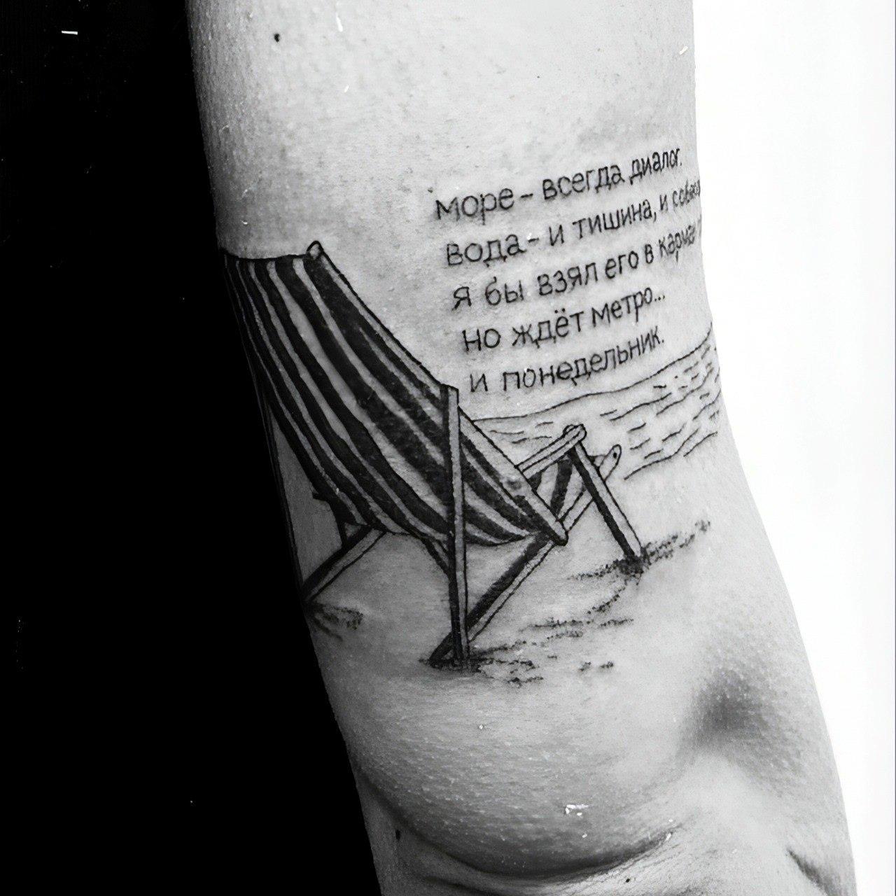 Как гласит история, сначала Даша набила мои строки «укатить бы сдуру на юг...» клиентке (ими я часто начинал или закрывал выступления), а потом и себе «море — всегда диалог...» с помощью друга-мастера.
