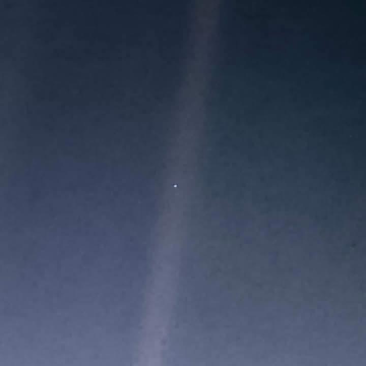 "Взгляните ещё раз на эту точку. Это здесь. Это наш дом. Это мы. Все, кого вы любите, все, кого вы знаете, все, о ком вы когда-либо слышали, все когда-либо существовавшие люди прожили свои жизни на ней. Множество наших наслаждений и страданий, тысячи самоуверенных религий, идеологий и экономических доктрин, каждый охотник и собиратель, каждый герой и трус, каждый созидатель и разрушитель цивилизаций, каждый король и крестьянин, каждая влюблённая пара, каждая мать и каждый отец, каждый способный ребёнок, изобретатель и путешественник, каждый преподаватель этики, каждый лживый политик, каждая «суперзвезда», каждый «величайший лидер», каждый святой и грешник в истории нашего вида жили здесь - на соринке, подвешенной в солнечном луче.
