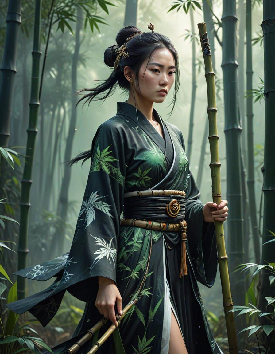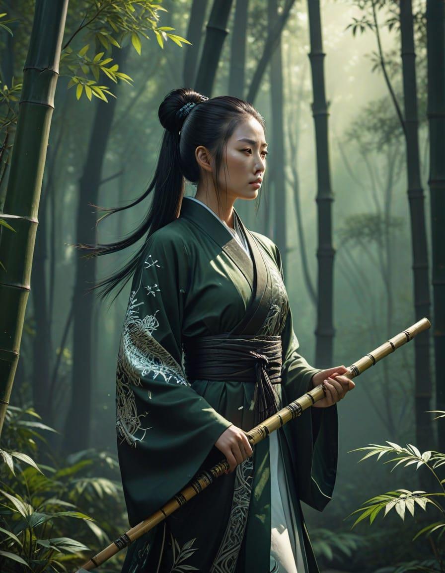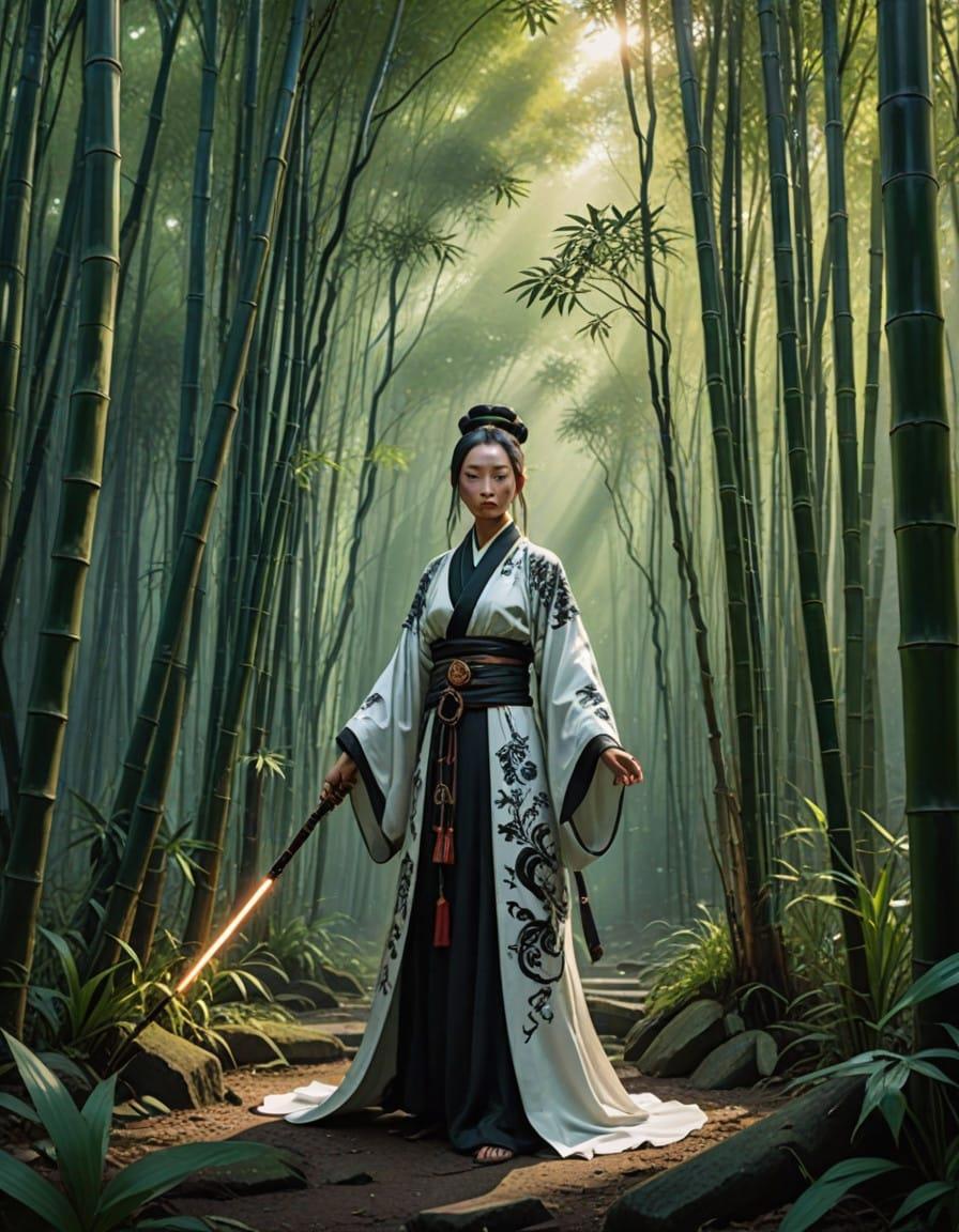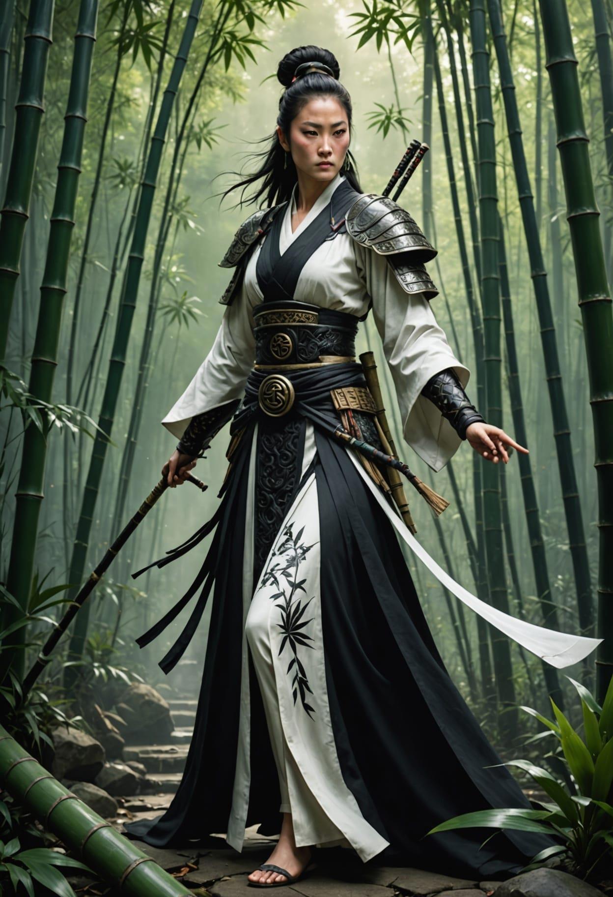 A serene yet powerful female warrior inspired by China, a flowing white and black robe reinforced with bamboo-patterned armor, staff is topped with a jade symbol of yin-yang, surrounded by an ancient bamboo forest, soft lighting, photorealistic, detailed, and serene
