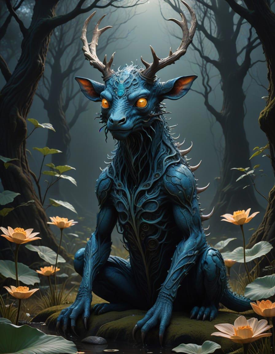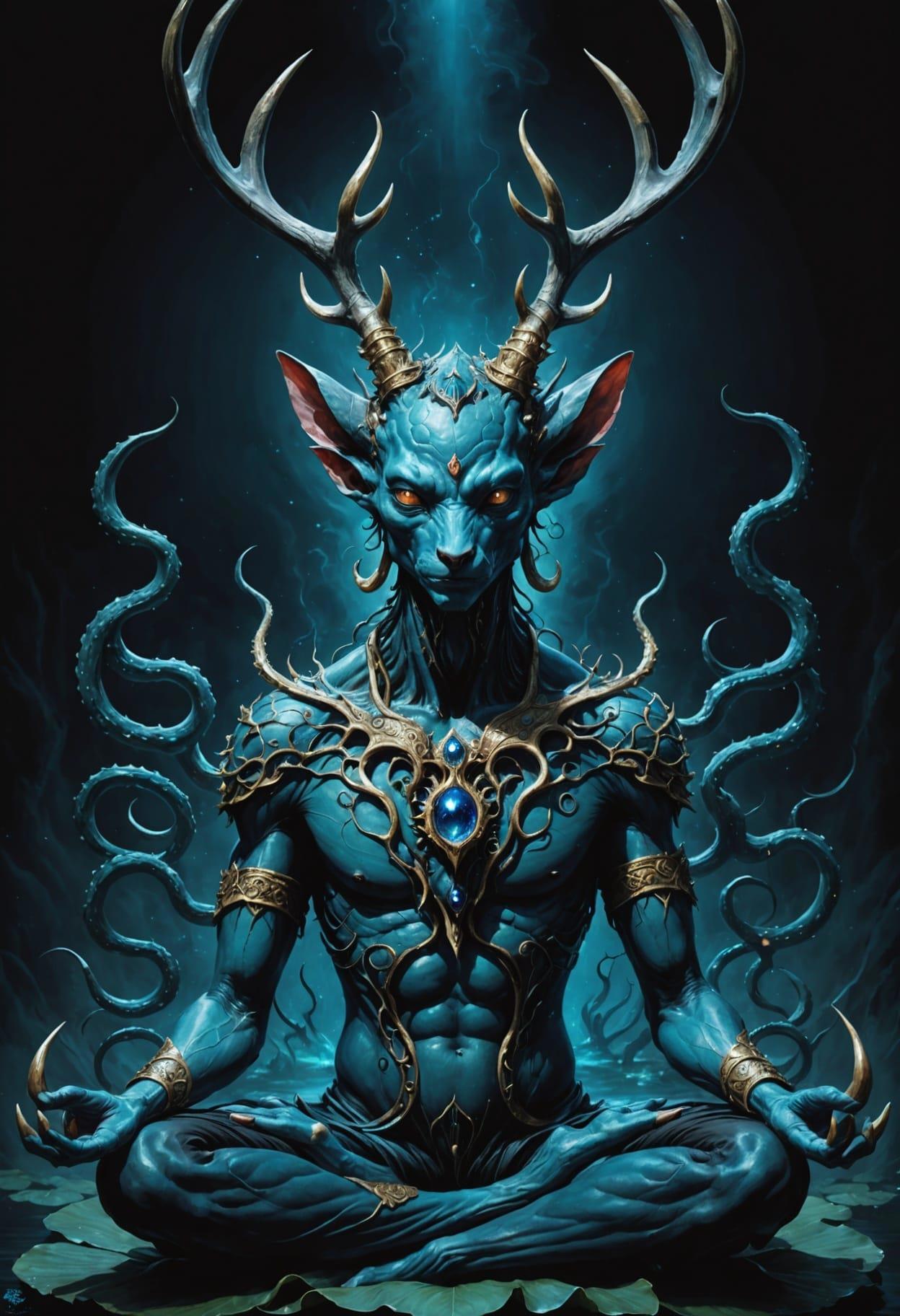 black background, lotus posture, fantasy blue monster in lotus posture, alien creature, deer horns, a lot of eyes, tentacles, black background, mistic, third eye, distant view, meditation, zen, lotus posture, realistic, oil painting style, dark background, distant view, high detailed, insane details, distant view