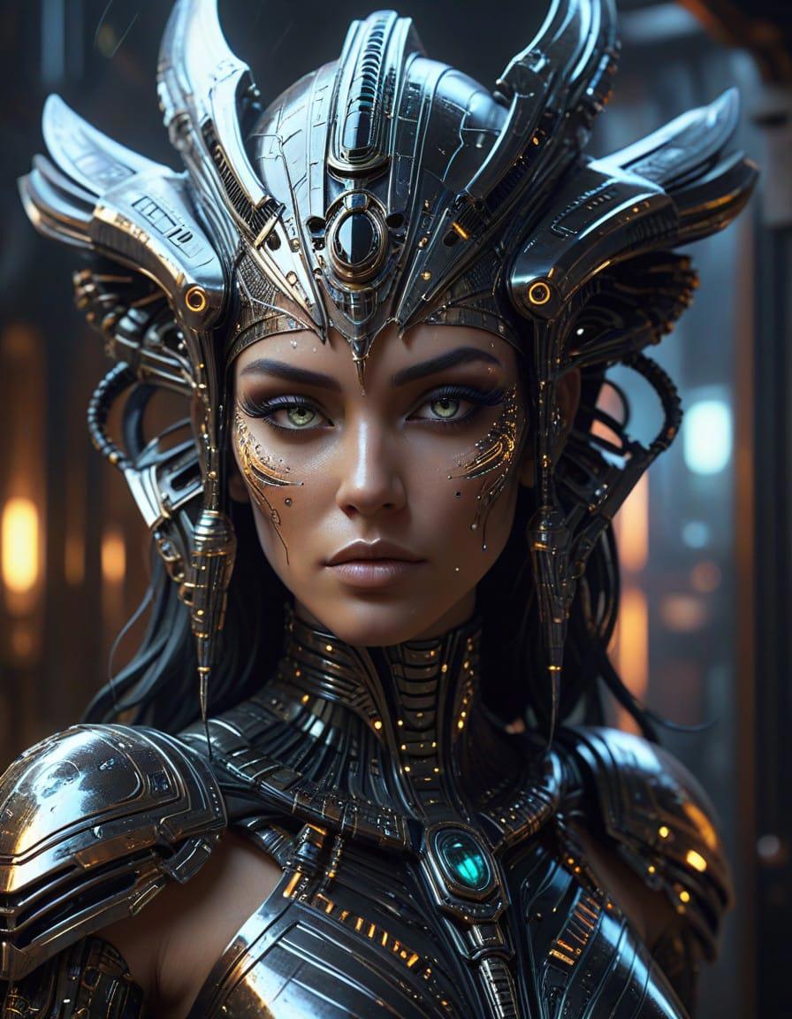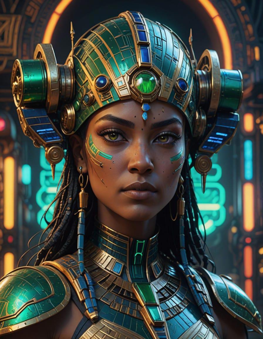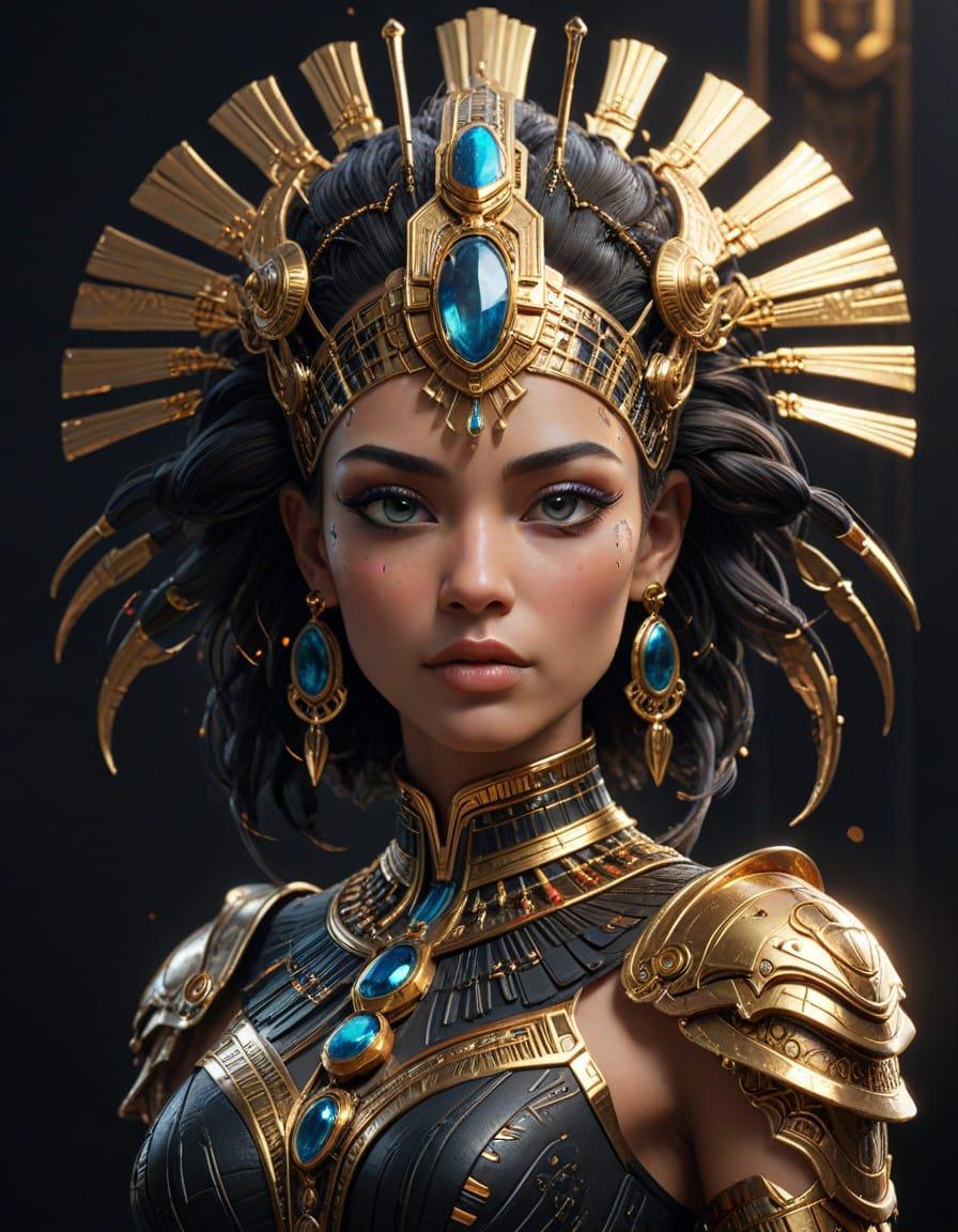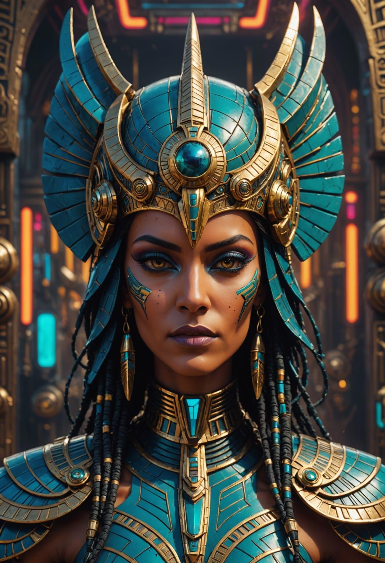 Pop Art Deco, Cyberpunk Egyptian Alien Empress Warrior, close up portrait