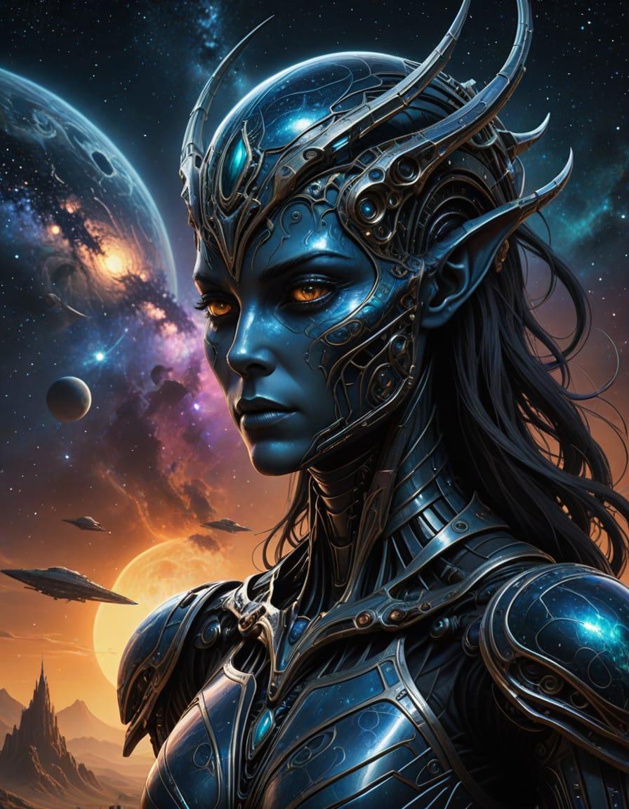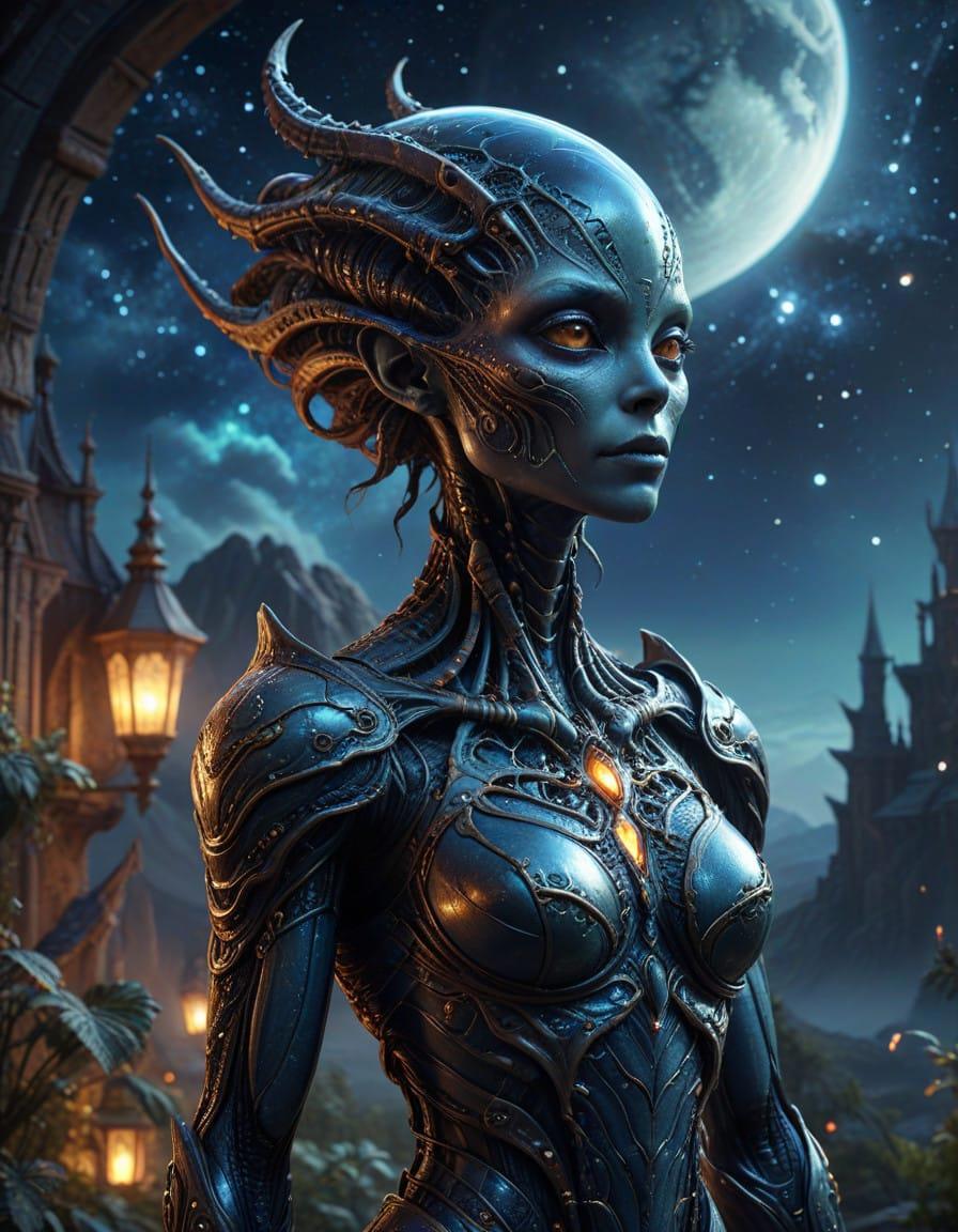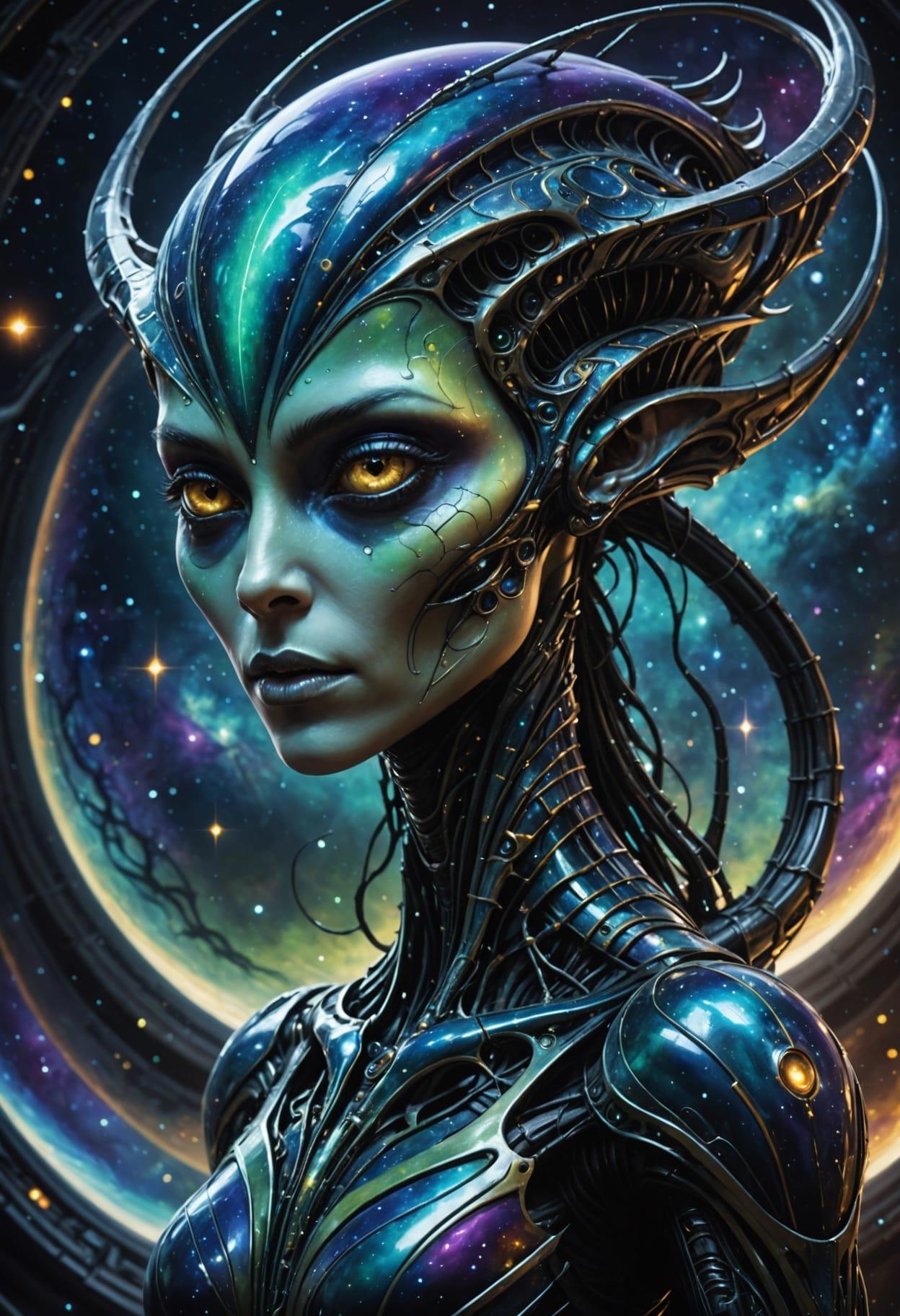 Elegant slim alien creature, portrait, extraterrestrial alien, adorable, light skin, galaxy, starry night, Irene Sheri, Hans Giger, Kerem Beyit